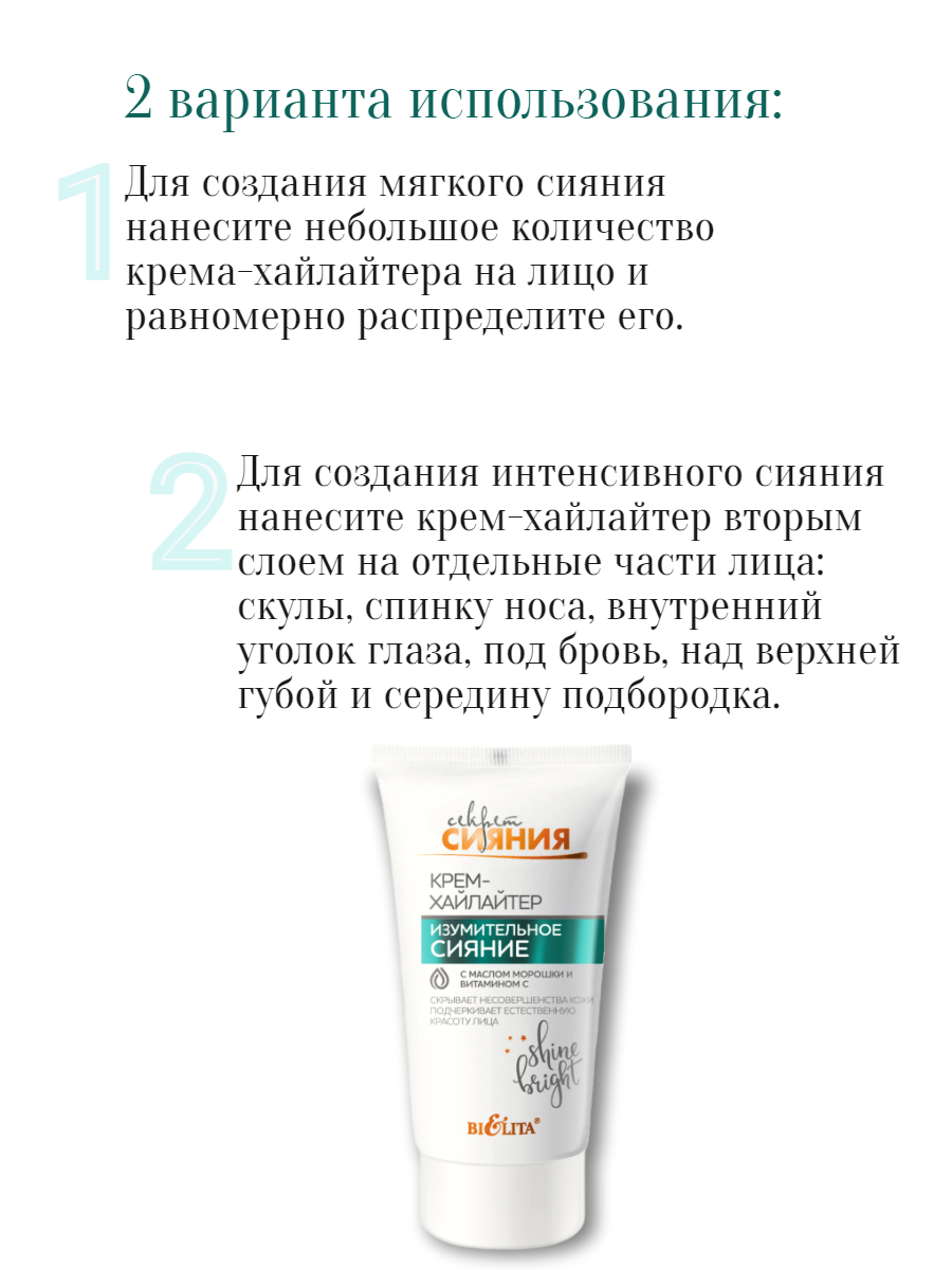 | Способ применения | для создания мягкого сияния нанесите небольшое количество крема-хайлайтера на лицо и равномерно распределите его. Для создания интенсивного сияния нанесите крем-хайлайтер вторым слоем на отдельные части лица: скулы, спинку носа, внутренний уголок глаза, под бровь, над верхней губой и середину подбородка |