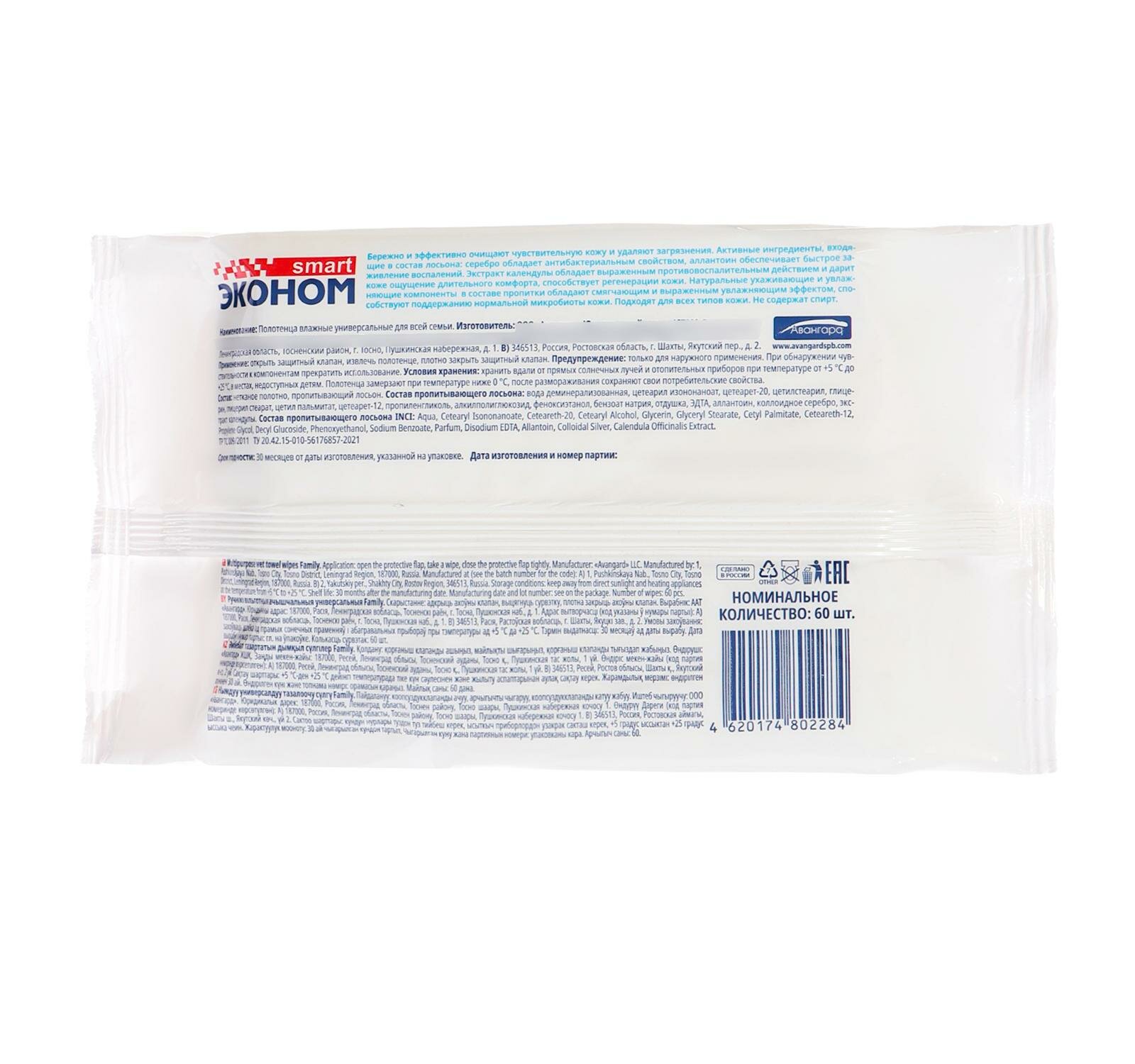 Полотенце влажное эконом SMART №60 для всей семьи универсальные 60ШТ авангард ООО 80228 | цена за 1 шт информация: