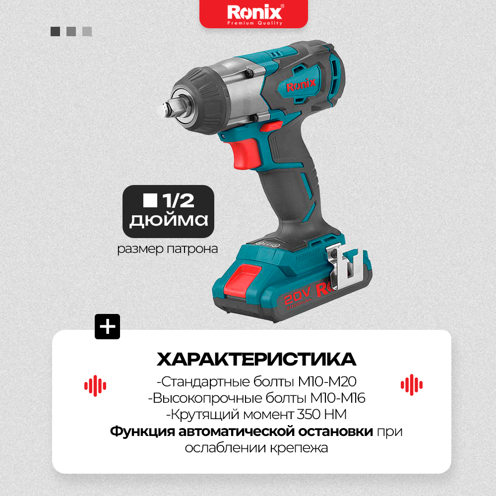 Гайковерт аккумуляторный Ronix 1/2, крутящий момент 350 H.m 2600 об/мин, 3300 уд/мин информация: