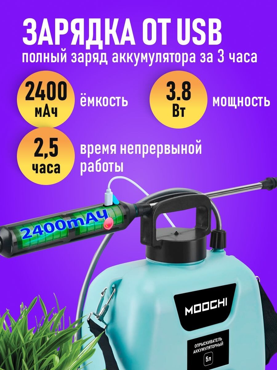 Опрыскиватель садовый MOOCHI, 5 л, плечевой, аккумуляторный, Li-Ion, 2.4 Ач информация: