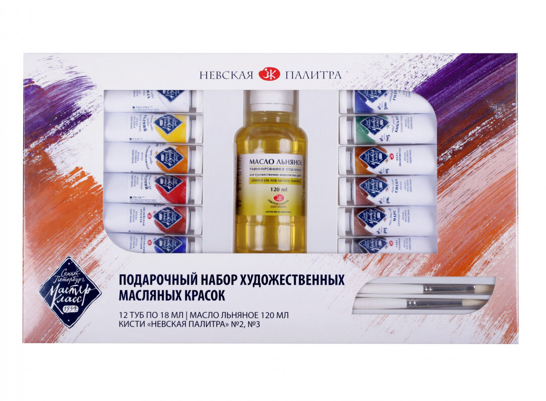 | Комплектация | - масляные краски 12 цветов по 18 мл; - кисти «Невская палитра» щетинные, длинная ручка, 2 шт. (плоская №2 и круглая №3); - масло льняное рафинированное отбеленное 120 мл |