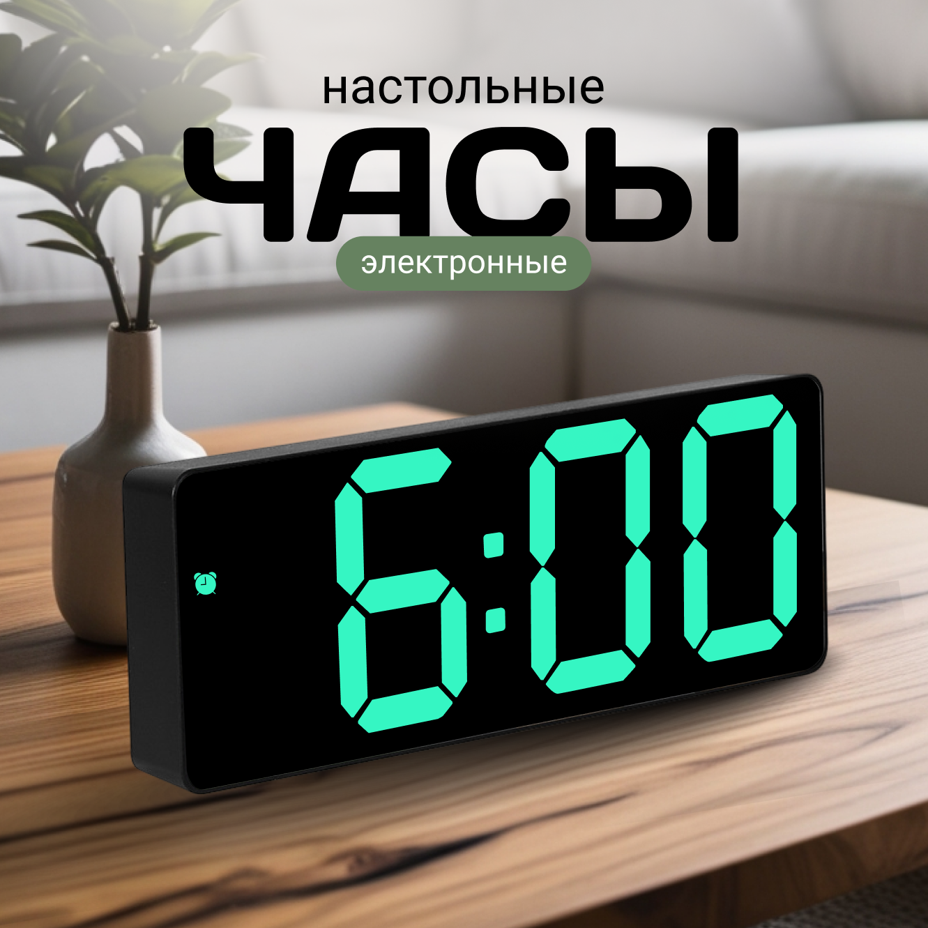 Часы настольные электронные на батарейках от сети, зеркальная поверхность, с зелеными цифрами, декор для кухни и дома 739 ₽