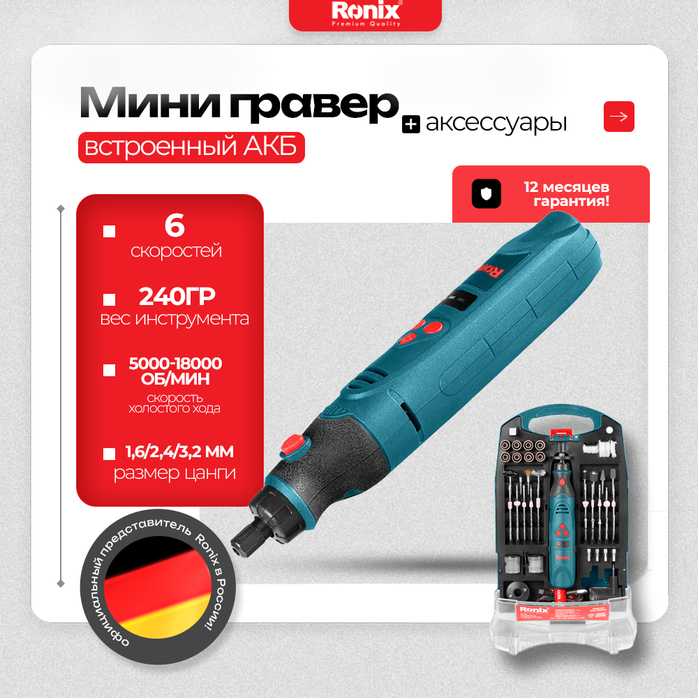 Аккумуляторный гравер Ronix с аксессуарами - 5 скоростей, до 30000 оборотов в минуту! 4 821 ₽