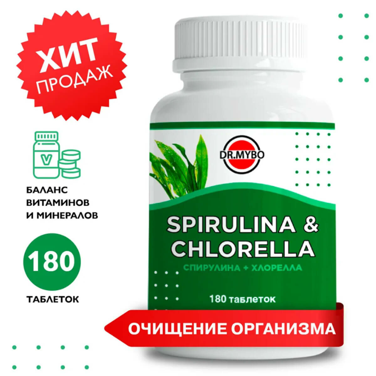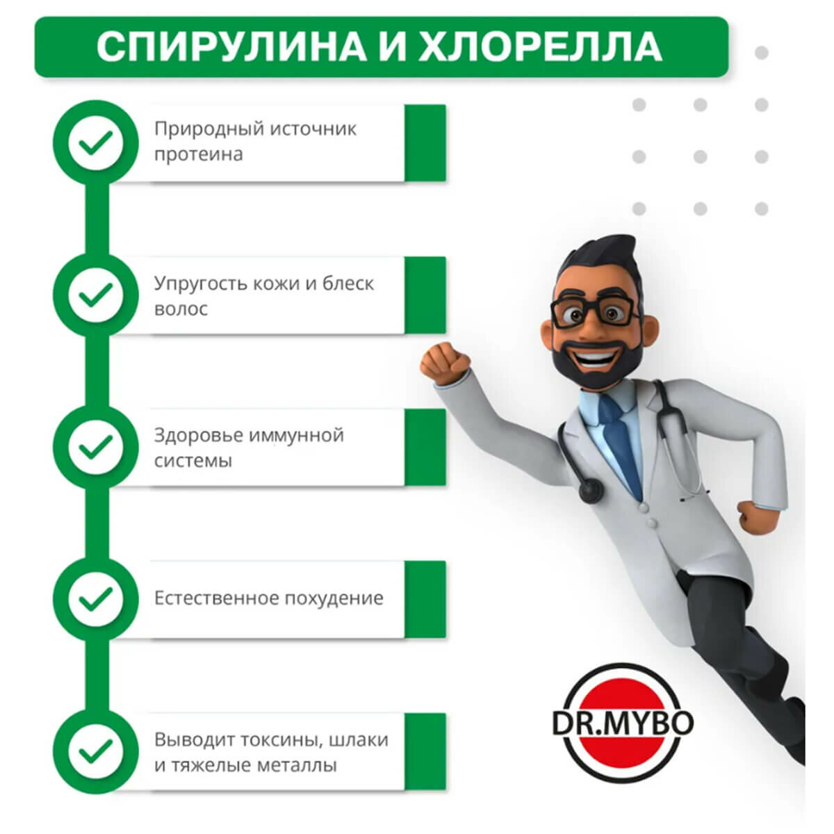 Спирулина+Хлорелла (микс) в таблетках, суперфуд, укрепление иммунитета, очищение от токсинов и шлаков, насыщение витаминами и микроэлементами, Dr.Mybo, 180таб 595 ₽