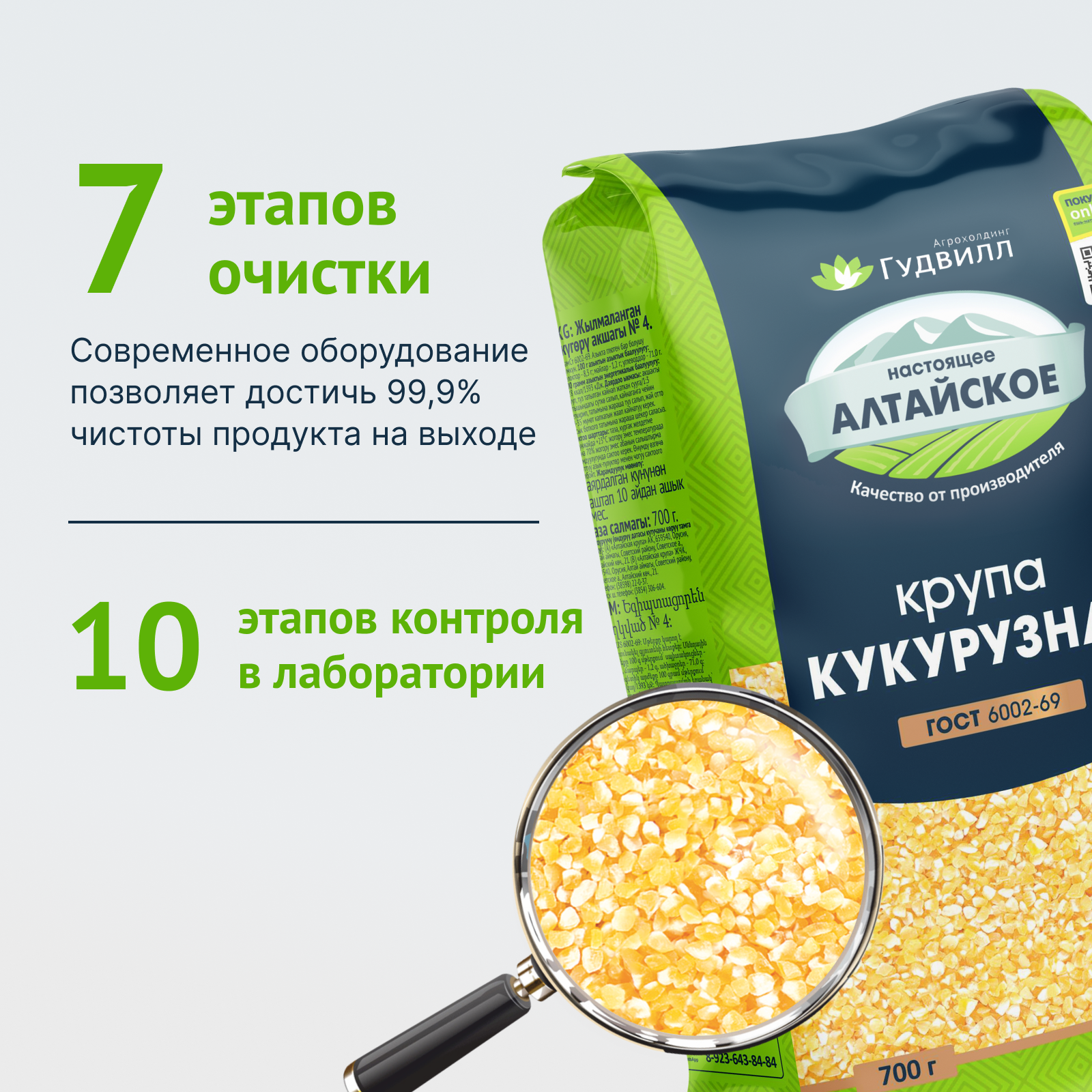 | Дополнительная информация | Кукуруза, выращенная на полях Агрохолдинга Гудвилл в предгорьях Алтая напитала в себя много солнечного света и воды из горных речек. Крупа имеет ярко желтый цвет и из нее получается вкусная ароматная каша. Современные технологии обработки зерна позволяют сохранять витамины и минеральные вещества, присутствующие в верхнем слое зерна. |