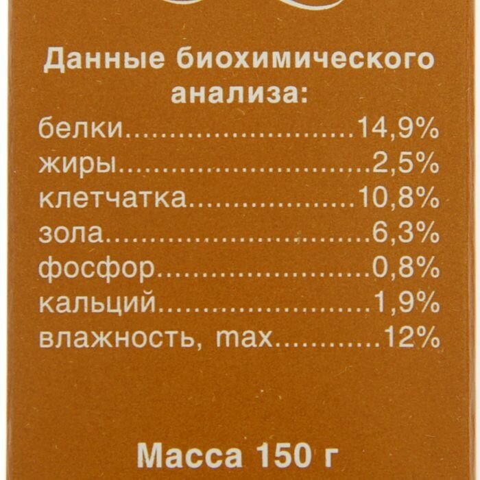 | Аналитические компоненты | белки - 14.90%, жиры - 2.50%, клетчатка - 10.80%, зольные вещества - 6.30%, влага - 12% |