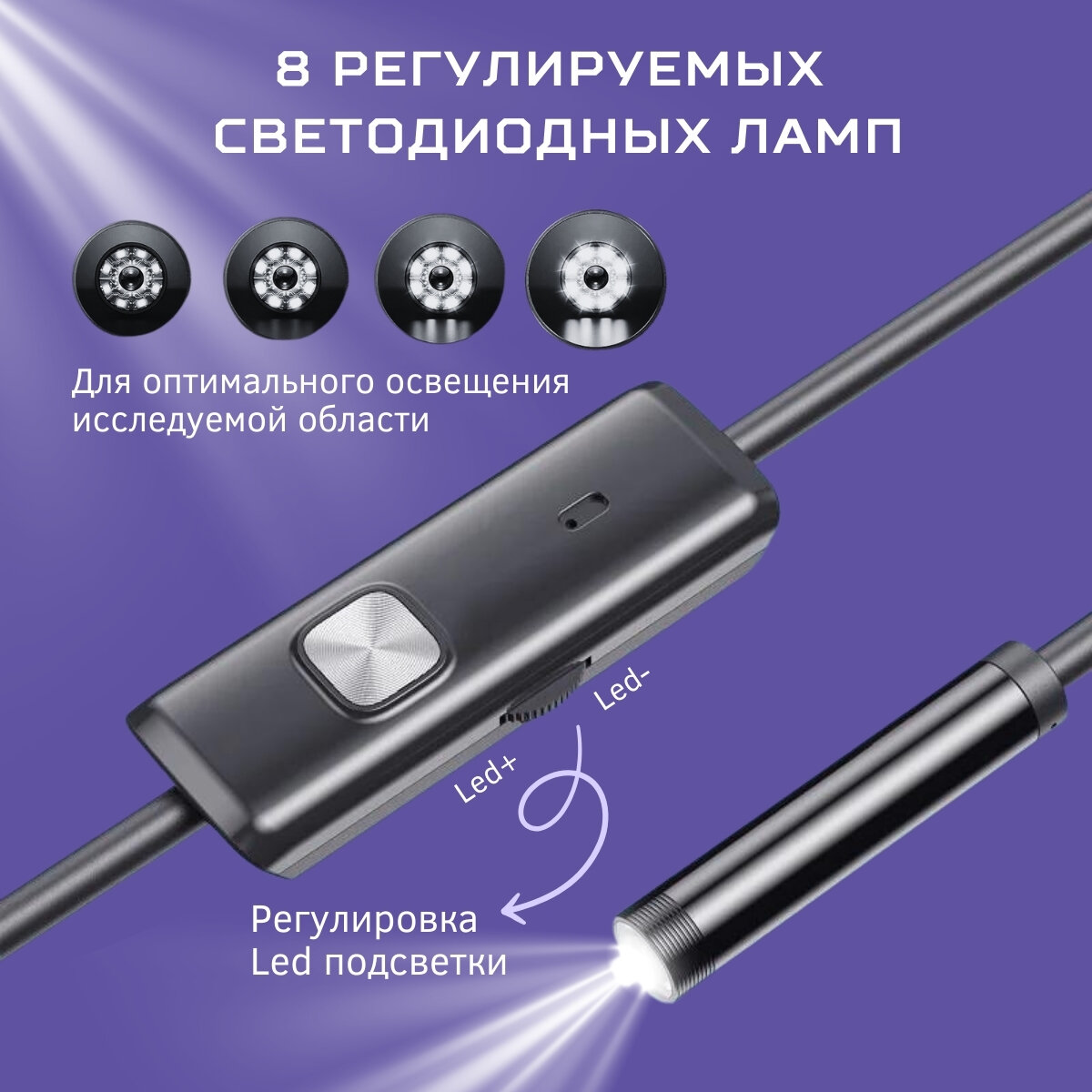 Эндоскоп для смартфона Android и компьютера, Видеоэндоскоп гибким проводом и камерой для труднодоступных мест 2 м 1 099 ₽