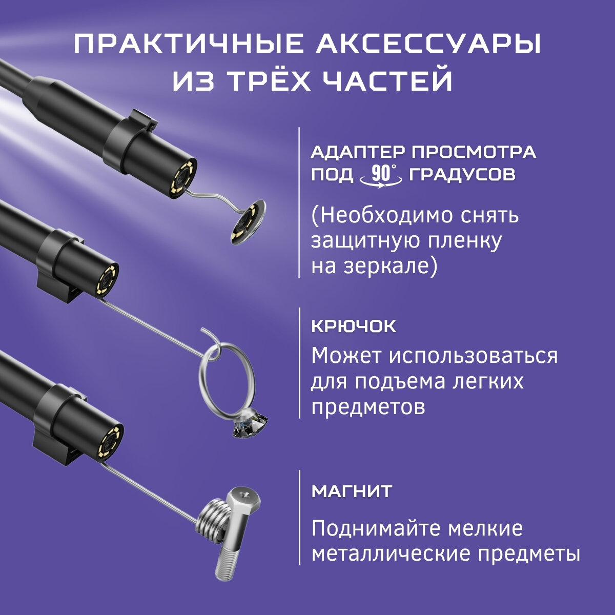 | Комплектация | Видеоэндоскоп 1шт, кабель Micrо-USB / USB / TYPE-C 1шт, переходник 1 шт, насадки 3 шт |