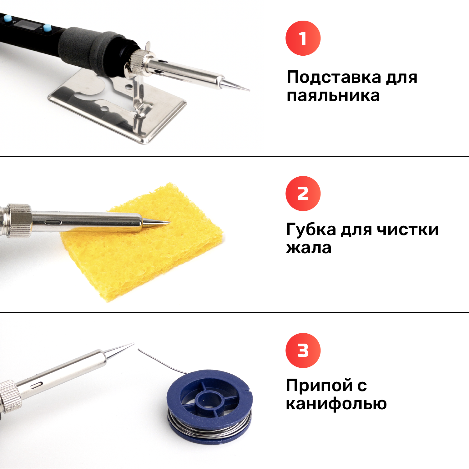| Комплектация | Паяльник 80 Вт — 1 шт. Комплект дополнительных сменных жал типа 900М — 5 шт. Подставка для пайки — 1 шт. Губка для чистки паяльника — 1 шт. Припой для пайки — 1 шт. |
