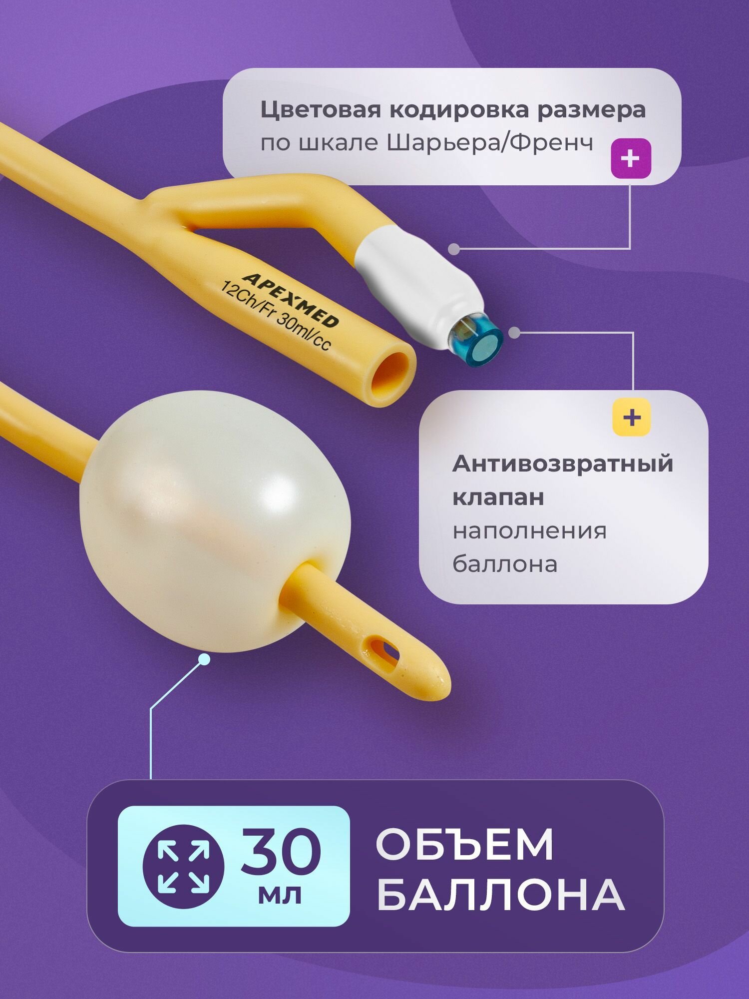 10 цен на APEXMED Катетер Фолея урологический универсальный, мужской, Ch/Fr 12, двухходовой, 2 шт, уретральный