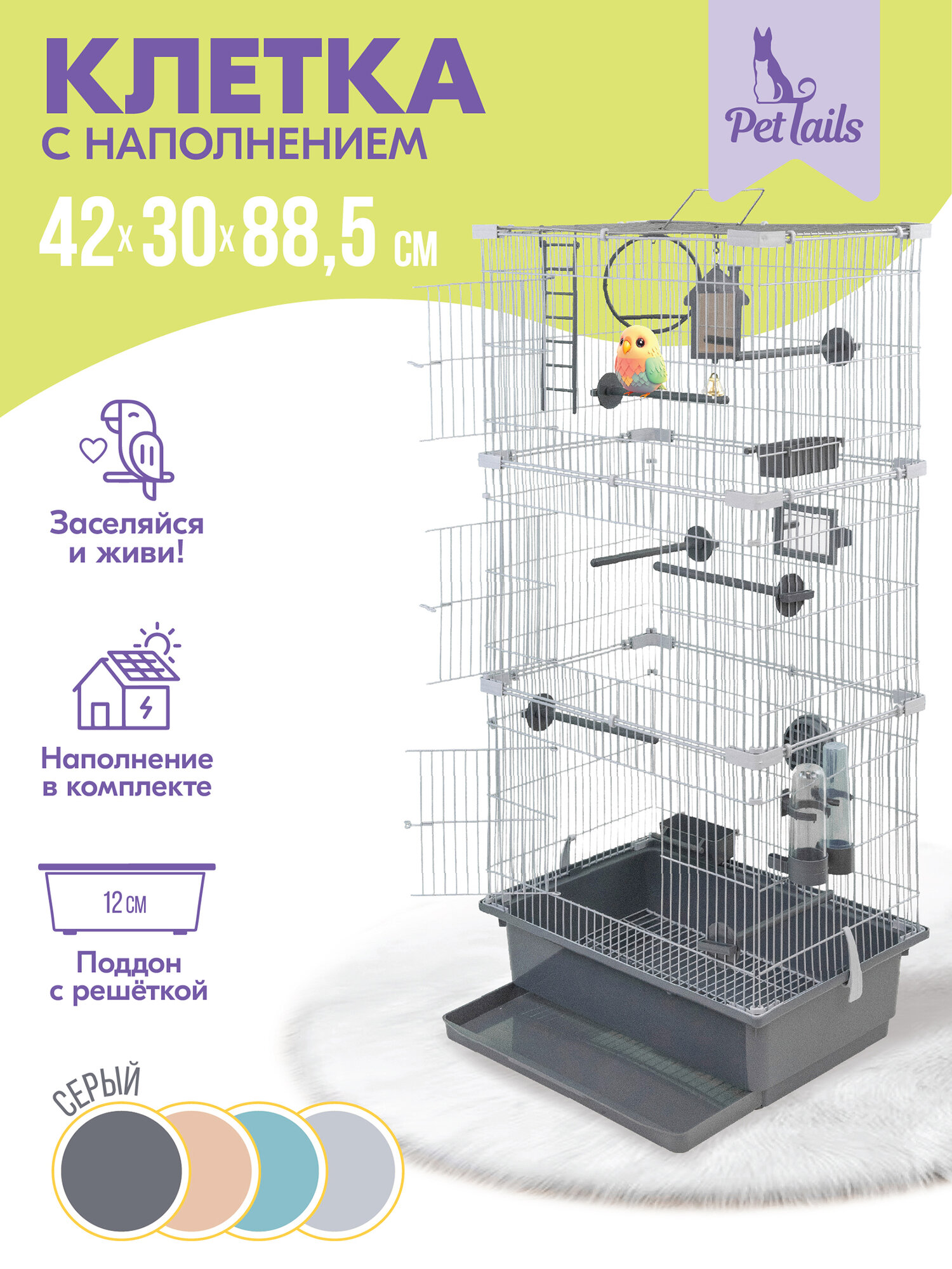 Клетка для птиц разборная "PetTails", шаг прута до 11мм, 42*30*h88,5см, серая информация: