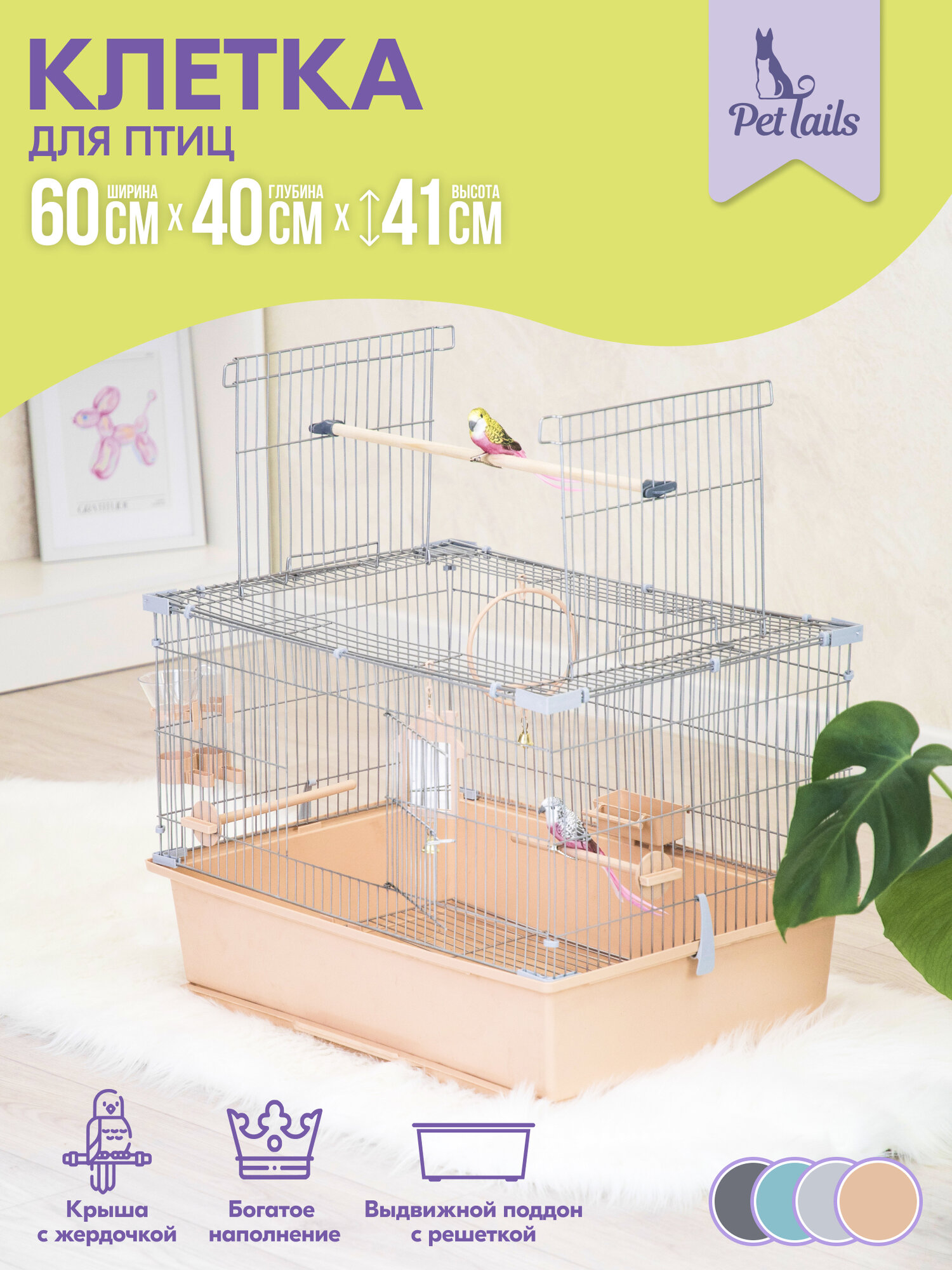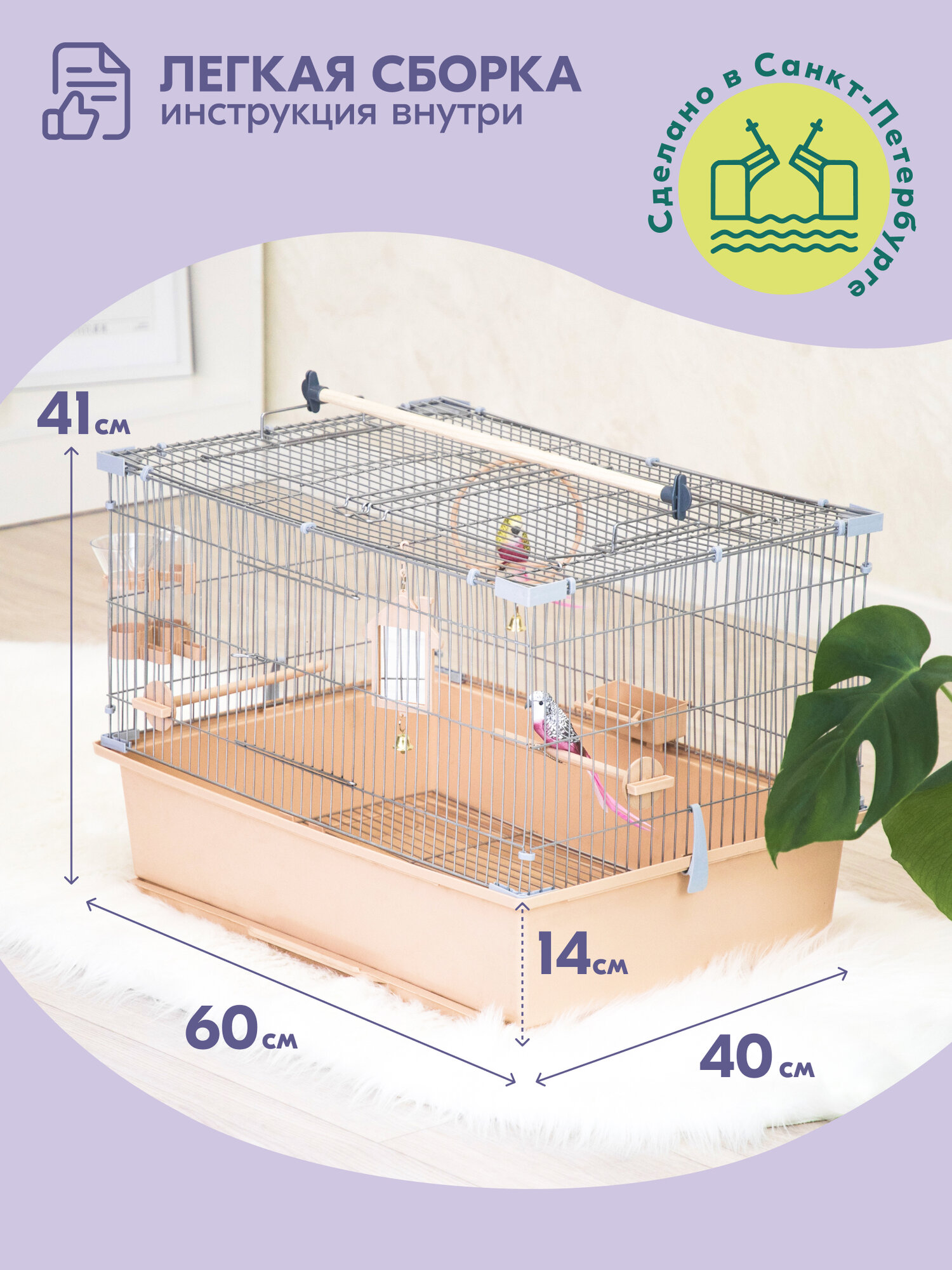 Клетка ГОВОРУН-1 "PetTails" для птиц разборная 60 х 40 х h41, 1 этаж, бежевая информация: