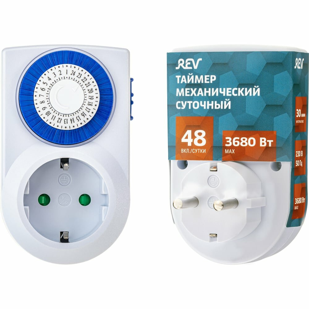 Таймер механический суточный REV "Промо", до 3680Вт, 48 включений в сутки, белый, 67074 8