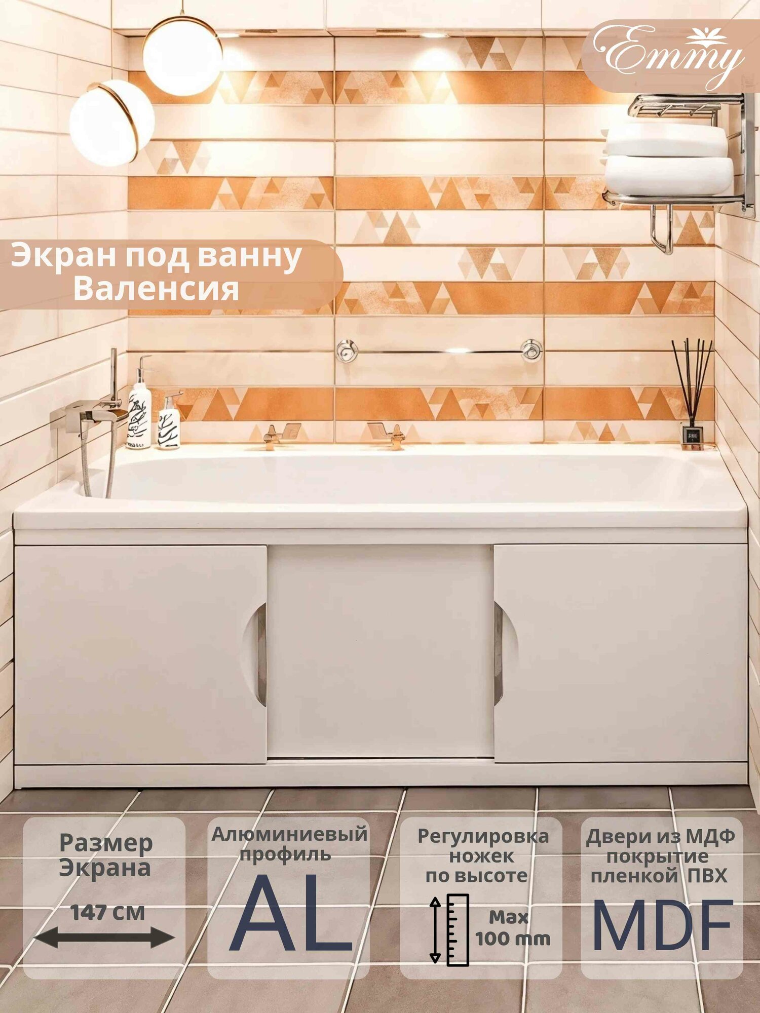 Экран для ванны Emmy "Валенсия 150" белый, с раздвижными дверцами МДФ, каркас алюминиевый профиль информация: