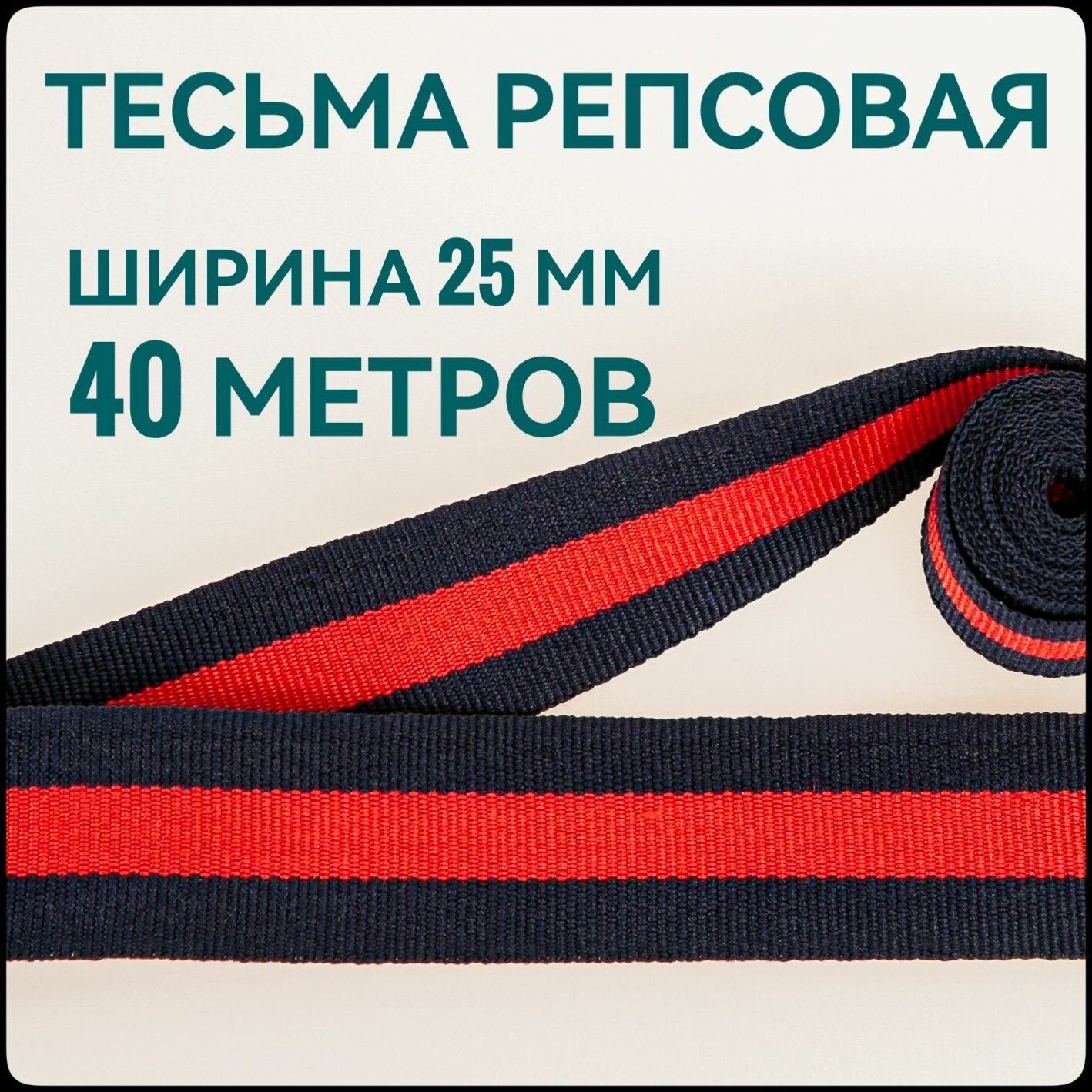 Тесьма /лента репсовая для шитья темно-синяя с красной полоской ш.25 мм, в упаковке 40 м, для шитья, творчества, рукоделия. информация: