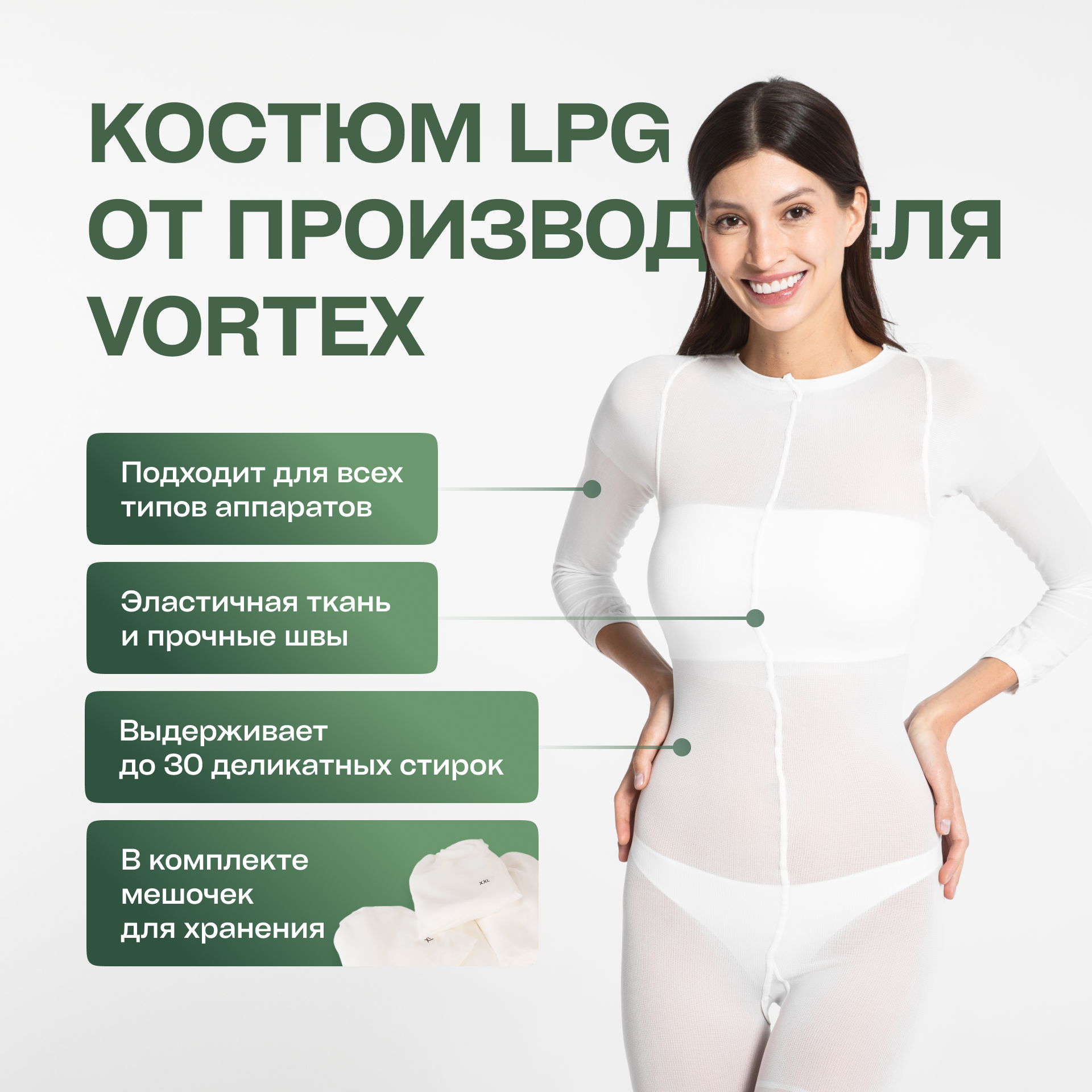 10 цен на Костюм Vortex для вакуумно-роликового LPG массажа 120 DEN, белый, XXL
