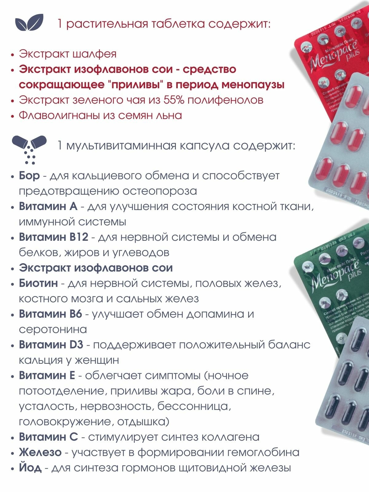 | Состав | Cостав капсулы: оксид магния, экстракт сои, аскорбиновая кислота, сульфат цинка, альфа-токоферил ацетат, фумарат железа, никотинамид, D-пантотенат кальция, сульфат марганца, ретинола ацетат, борат натрия, сульфат меди, цианокобаламин, тиамина мононитрат, рибофлавин, пиридоксина гидрохлорид, витамин Д3, фолиевая кислота, хлорид хрома, йодид калия, селенат натрия, биотин, картофельный крахмал, МКЦ Е460, диоксид кремния (Е551), Е553, стеарат магния Е470, оболочка капсулы: желатин, очищенная вода, Е171, Е141.Состав таблетки: экстракт сои, экстракт листьев шалфея лекарственного, экстракт зеленого чая, флаволигнаны из семян льна, Е460, Е341, Е171, Е172, Е464, Е463, Е464, Е1520, Е171, Е551, Е570, Е470. |