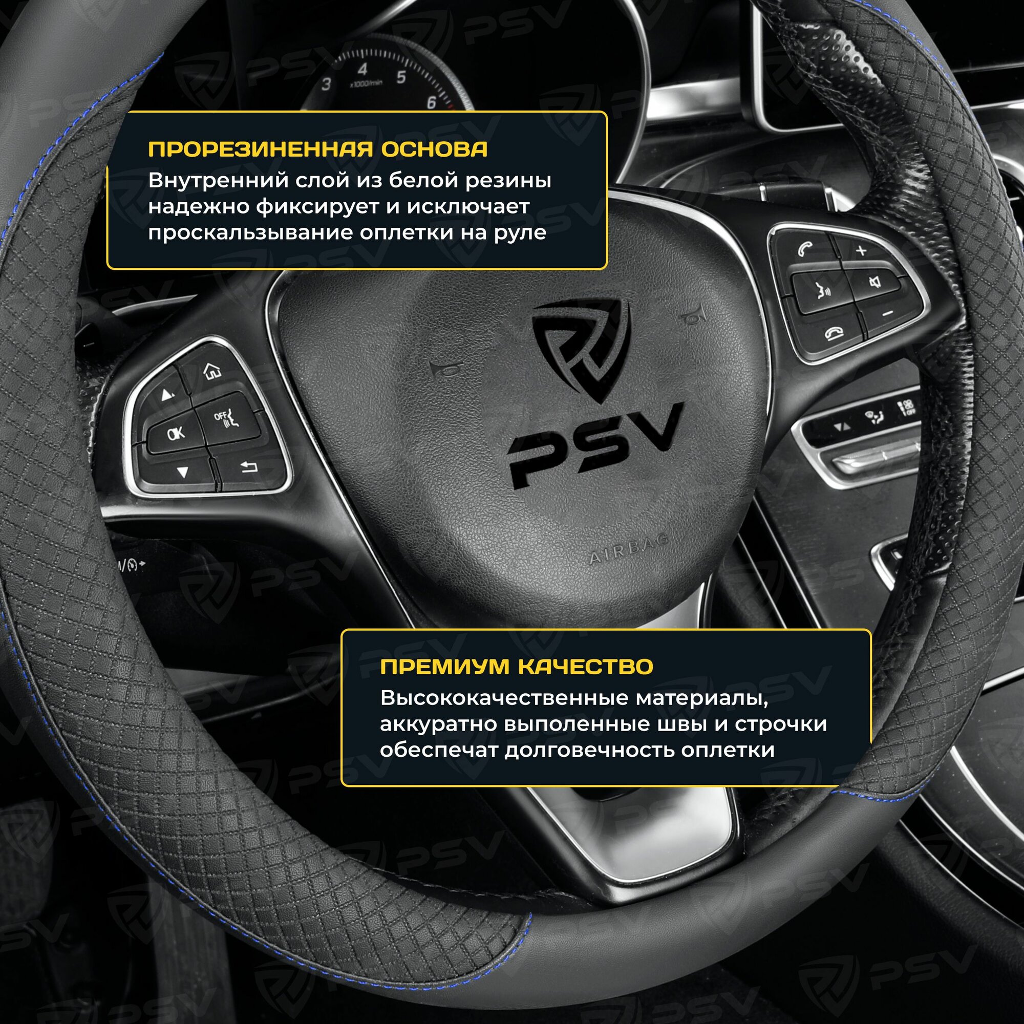Оплетка чехол на руль PSV GREAT (Черный, строчка синяя) M 37-39 см, экокожа, 136827 950 ₽
