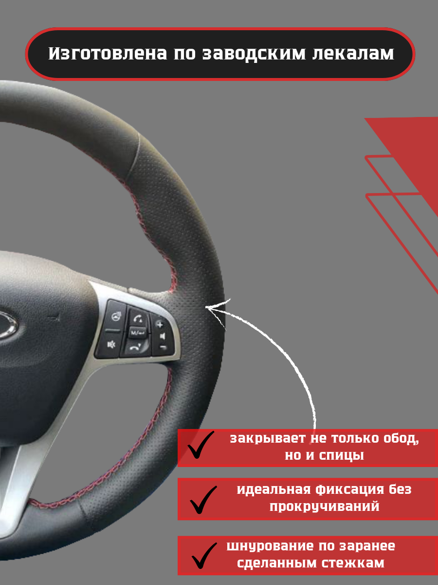 Оплетка на руль LADA Vesta I (2015-н.в.), Лада Xray I (2015-н.в.) из экокожи для руля без штатной кожи (красная нить) 1 650 ₽