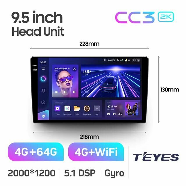 Магнитола Teyes CC3 2K 4/64GB Универсальная 9 дюймов, 8-ми ядерный процессор, QLED экран, 2 DSP, 4G, Wi-Fi, 2 DIN информация: