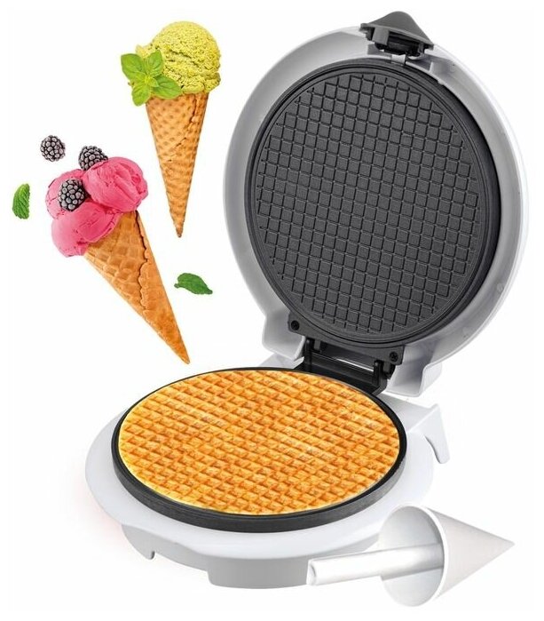 Особенности | антипригарное покрытие, индикатор работы, конус для рожков в комплекте |