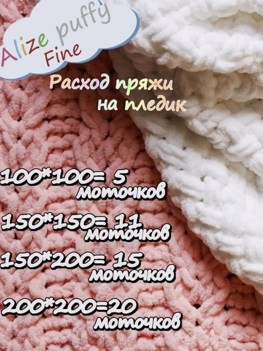 | Дополнительная информация | высота петли 2 см; в 1 метре пряжи примерно 70 петелек; сколько мотков пряжи Pyffy Fine нужно на плед: плед 1 м x1 м — 5 мотков; плед 1,5 м x1,5 м — 11 мотков; плед 1,5 м x 2 м — 15 мотков; плед 2 м x 2 м — 20 мотков |
