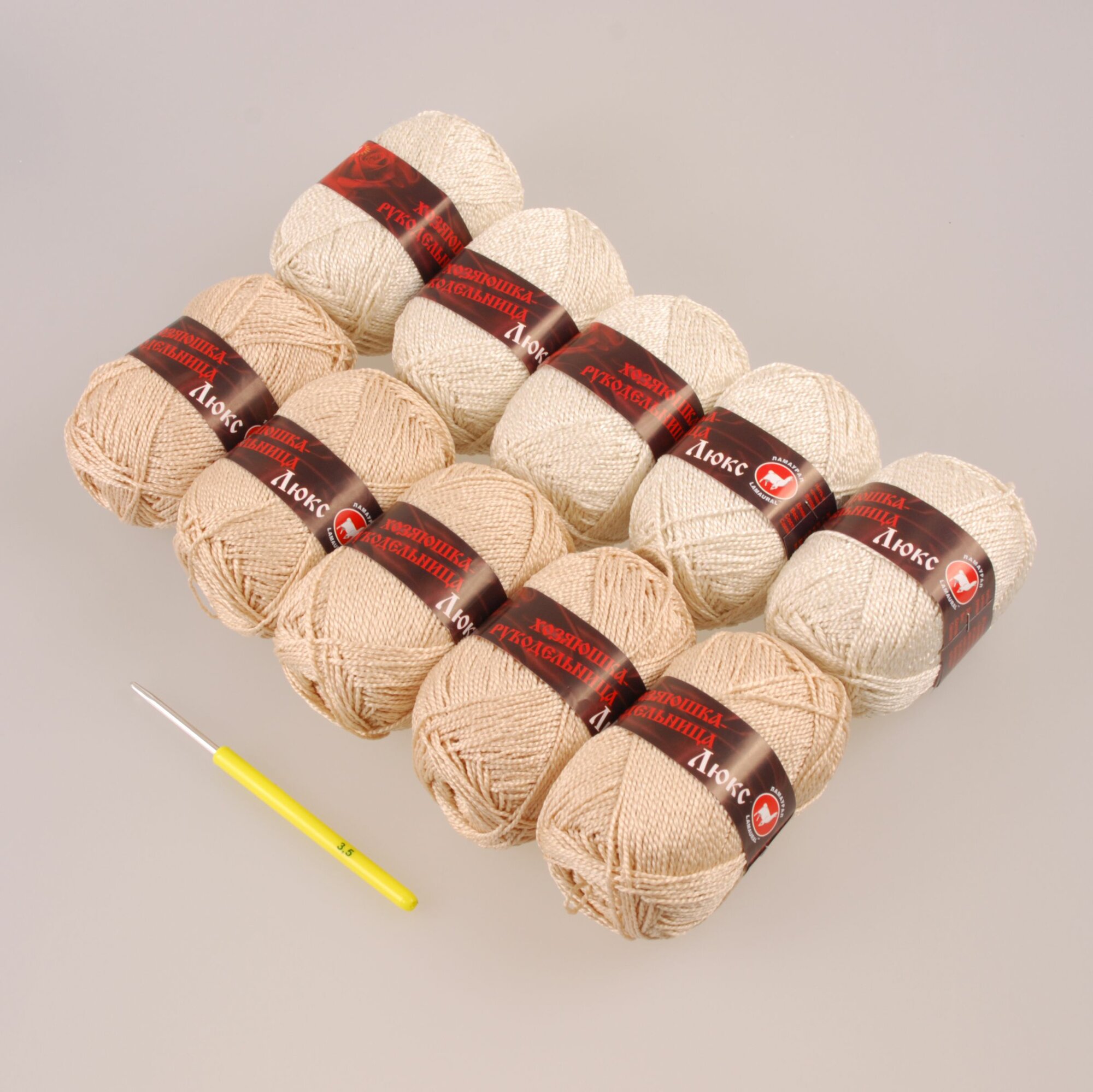 Пряжа Хозяюшка-рукодельница Люкс, 50 г/140м, дуэт 5+5 шт бежевый/жемчуг + крючок №3.5 650 ₽