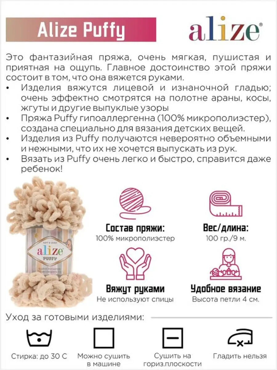 Пряжа для вязания ALIZE Puffy Ализе Пуффи: 310 (шампань), 5 шт 9 м 100 г, 100% микрополиэстер, большие петли 1 350 ₽