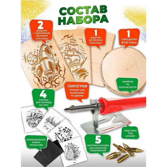 10 цен на Набор для выжигания по дереву (аппарат с насадками, доски 3 шт, спил 1 шт.)