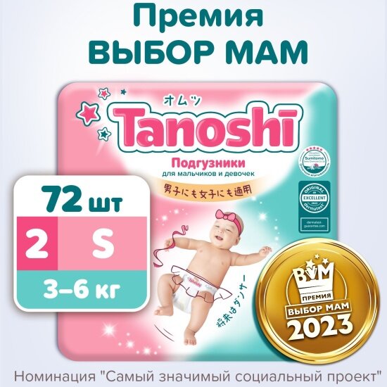 Tanoshi Подгузники для детей, размер S 3-6 кг, 72 шт.