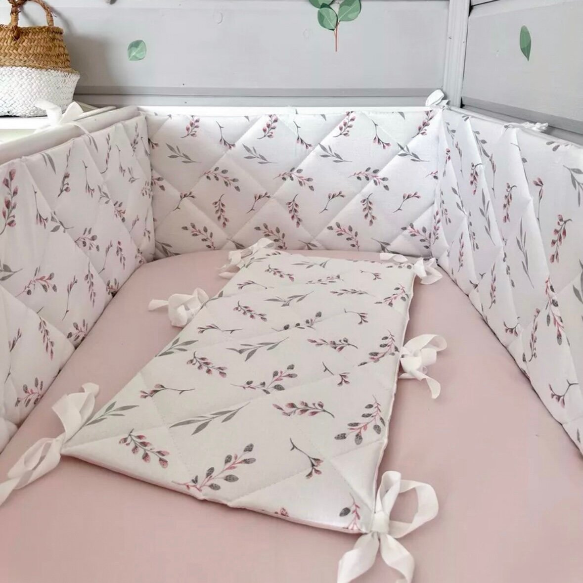 10 цен на Бортики в кроватку для новорождённых, верба пудра, 100% хлопок, 60х30 см - 2 шт, 120х30 см - 2 шт, MamiBro