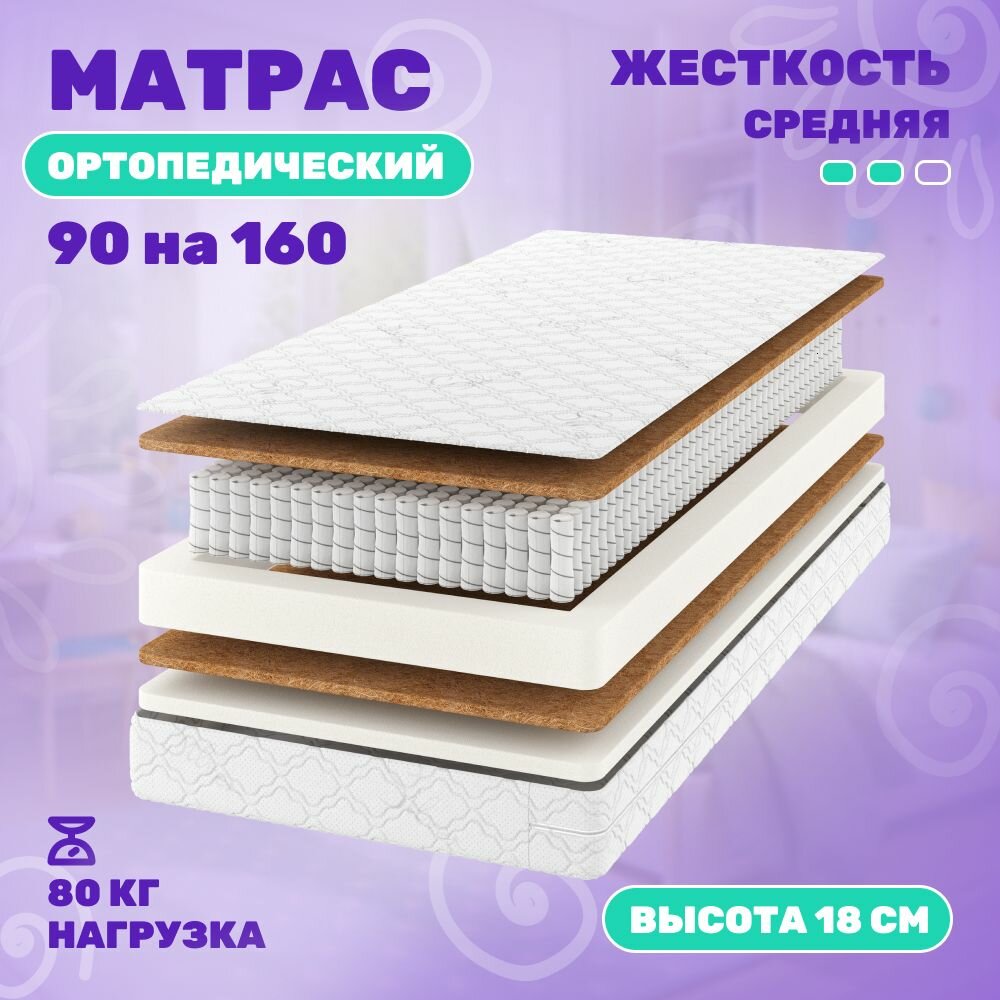 Фабрика Сна Матрас EDMOND, независимые пружины, кокос, средняя жесткость, анатомический, 90х200 см