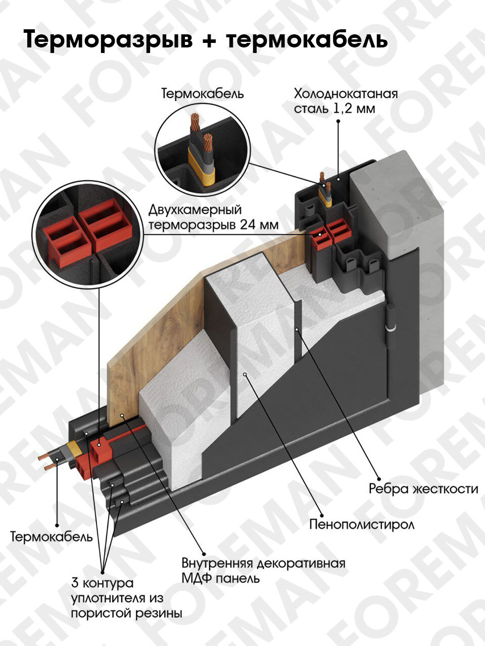 | Дополнительная информация | Выбирая двери Foreman, Вы приобретаете стальные двери с шумоизоляцией, надежно оберегающие уют и тепло Вашего дома. Продуманная конструкция, применение высококачественных комплектующих и материалов, простота использования обеспечивают безопасность и комфорт на долгие годы. Двери комплектуются качественной, изысканно подобранной фурнитурой. |