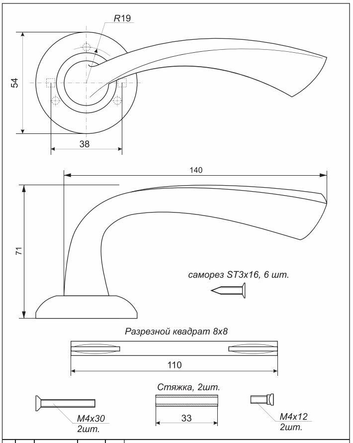 | Комплектация | Ручки дверные - 2 шт , Квадрат 8х8х110мм - 1 шт , Ключ шестигранный - 1шт , Винт с фиксацией М6*8 - 2шт , Комплект крепежа для установки на стяжные винты - 1 шт , Комплект крепежа для установки на саморезы -1шт |