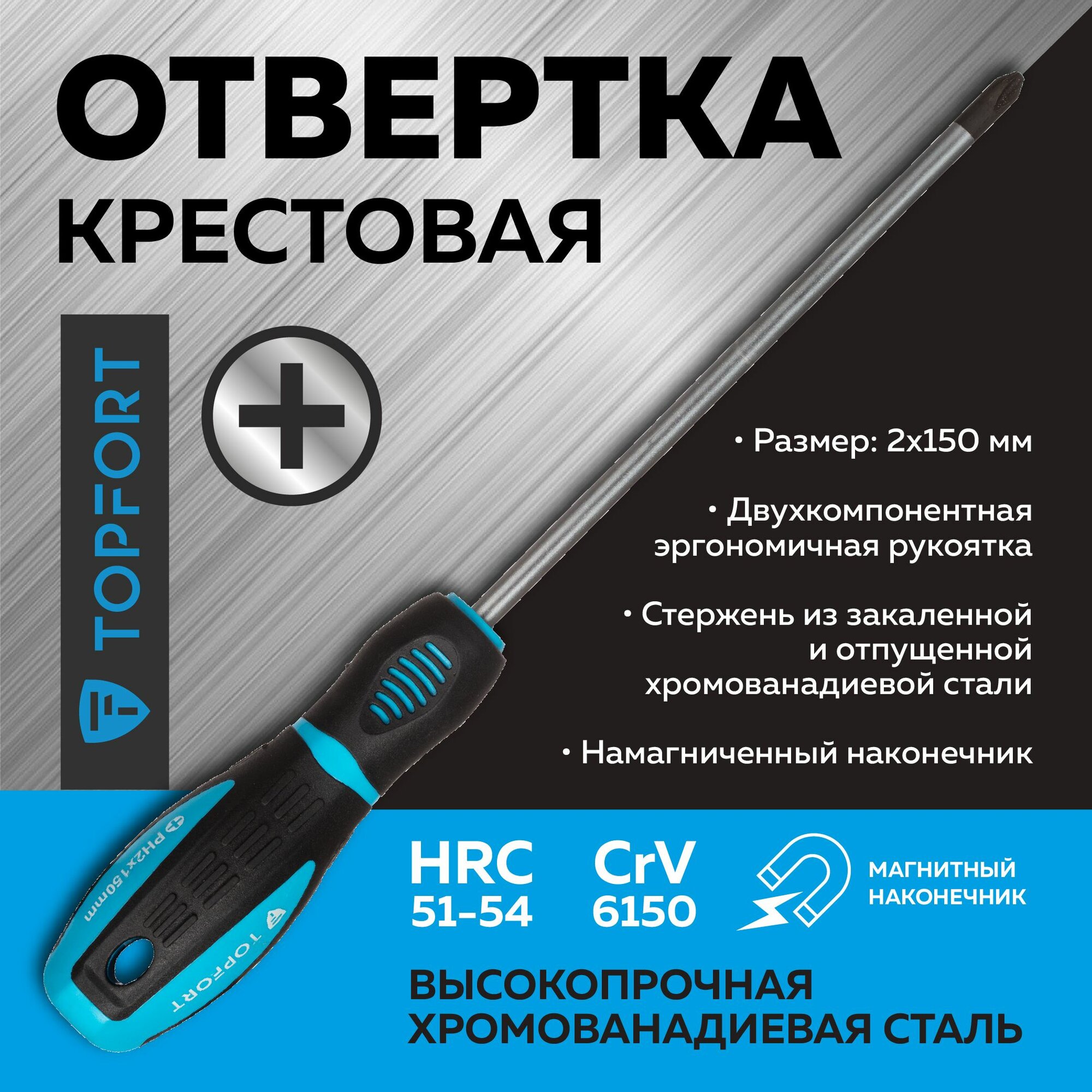 Отвертка крестовая Topfort, PH2, TPR-вставка, магнитный наконечник, длина 150мм информация: