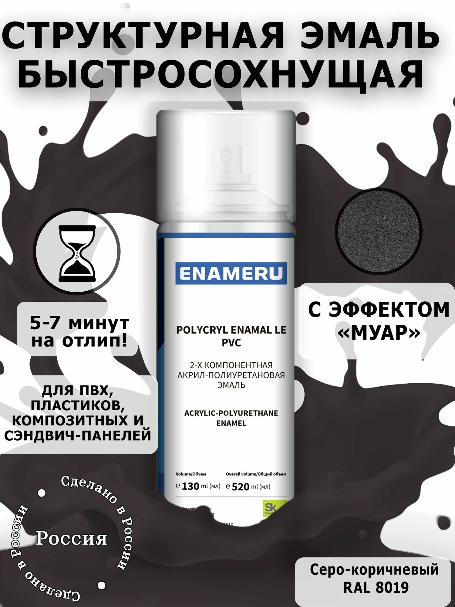 Структурная краска для ПВХ, пластика, окон Энамеру, Быстросохнущая, Акрил-полиуретановая, Полуматовая, 0.52 л, Серо-коричневый RAL 8019 1 500 ₽