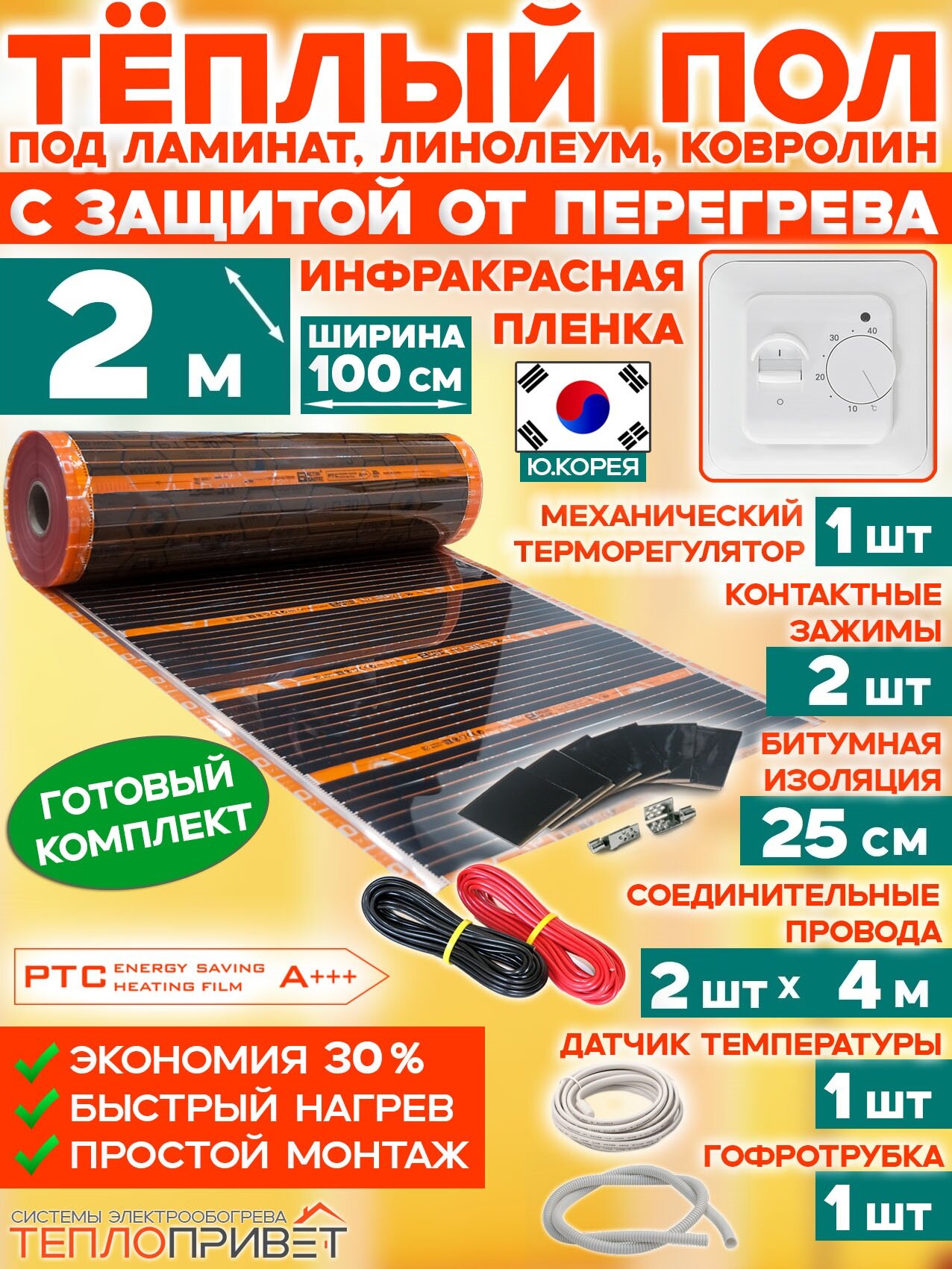 Инфракрасный теплый пол Eastec PTC 2 м х 100 см 440 Вт комплект саморегул. TLS-100-2 + механический терморегулятор информация: