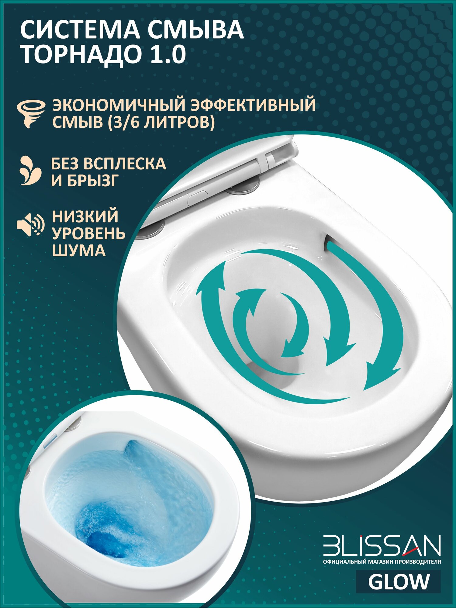 Унитаз напольный безободковый BLISSAN Glow Торнадо 1.0 с сиденьем микролифт быстросъемное информация: