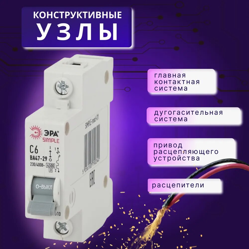 Автоматический выключатель 1P (1П) 6А (С) 4,5кА ВА 47-29 SIMPLE-mod-01 ЭРА Б0039218 1шт информация: