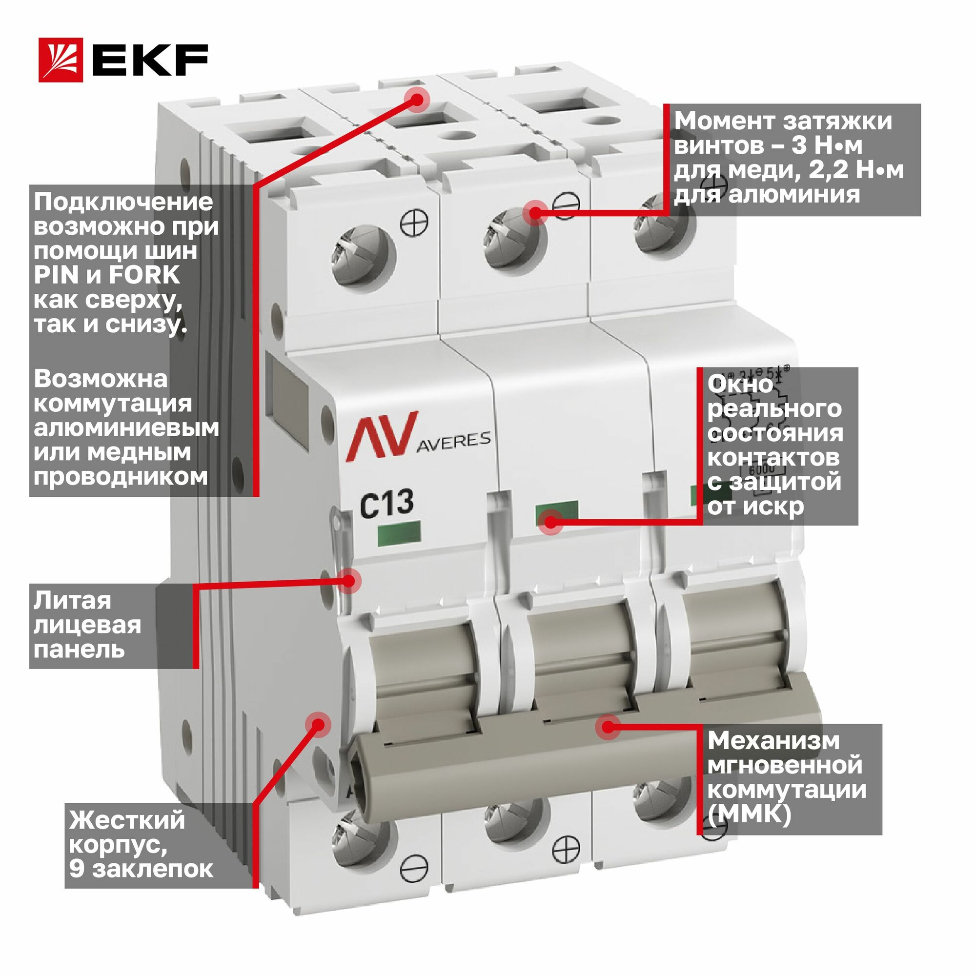 Автомат постоянного тока 13А, тип C, трехполюсный 3P, 6kA, EKF AVERES AV-6 DC (Выключатель автоматический C13 (DC)) информация: