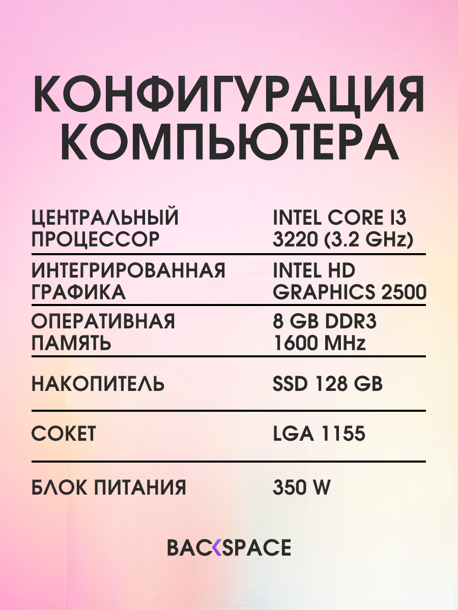 Компьютер Системный блок i3 3220, RAM 8 ГБ, SSD 120 ГБ, intel HD graphics 2500, Windows 10 Pro BACKSPACE информация: