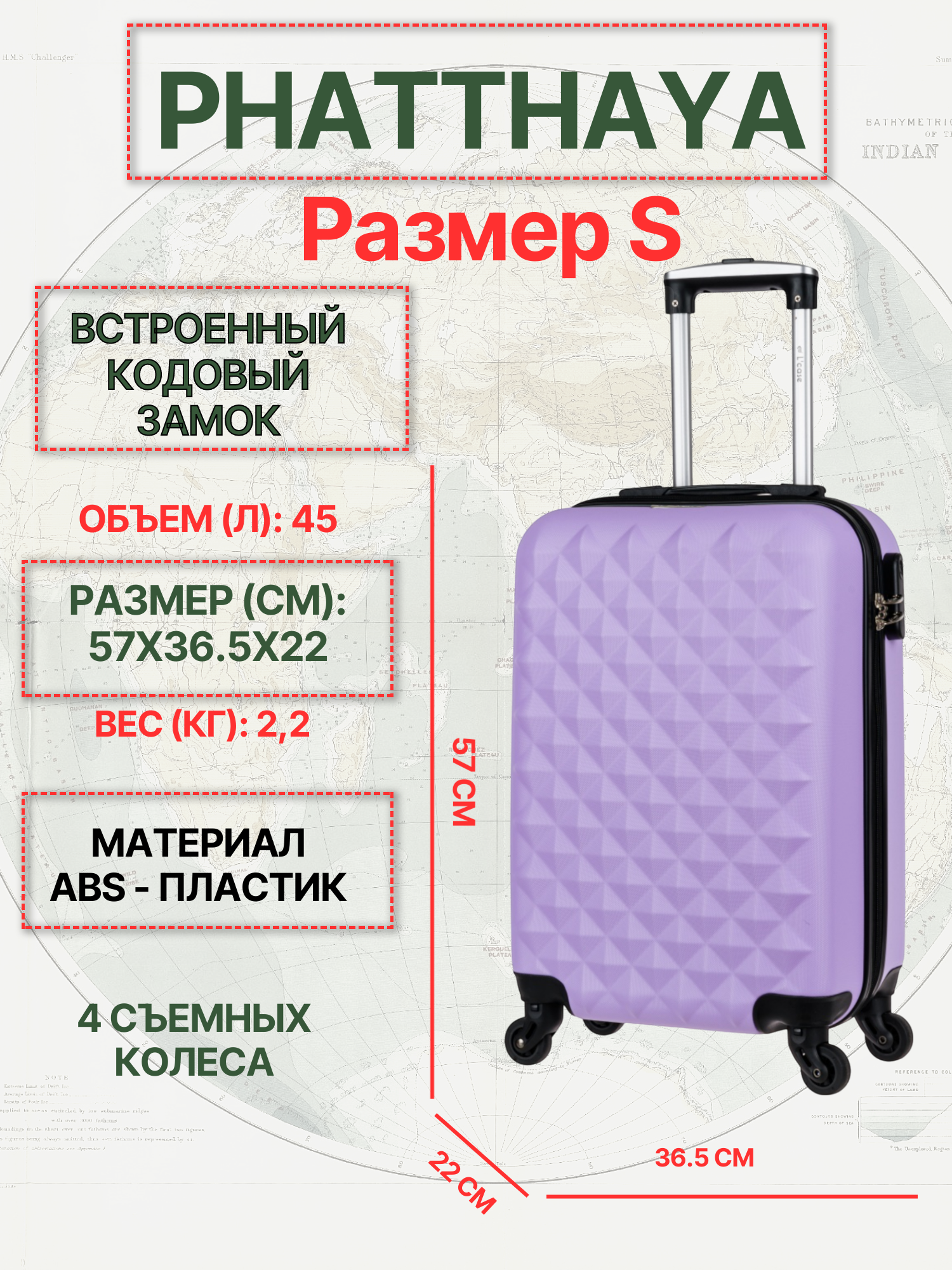 Чемодан L'case Phatthaya, 45 л, размер S, лиловый информация: