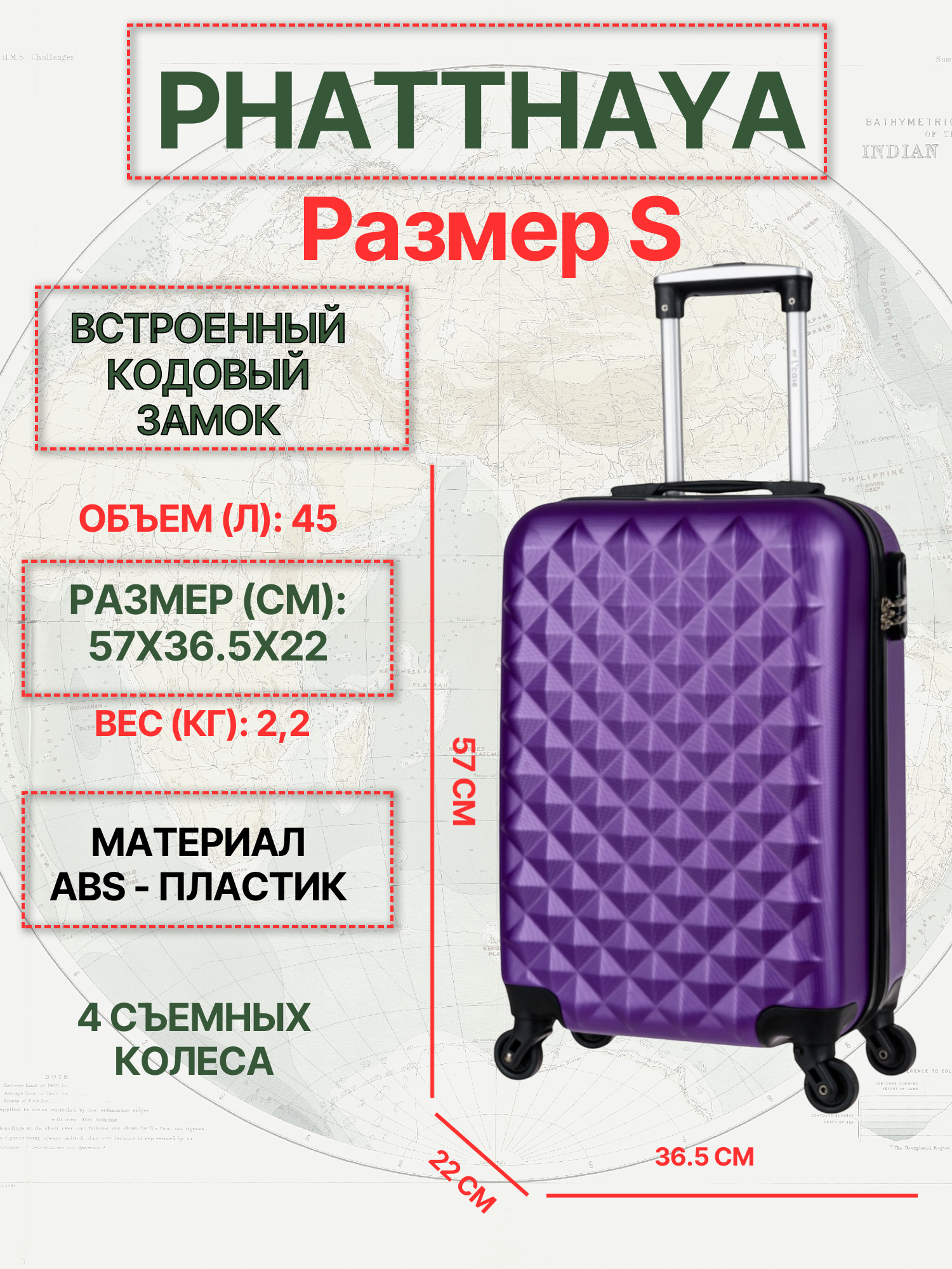 Чемодан L'case Phatthaya, 45 л, размер S, фиолетовый информация: