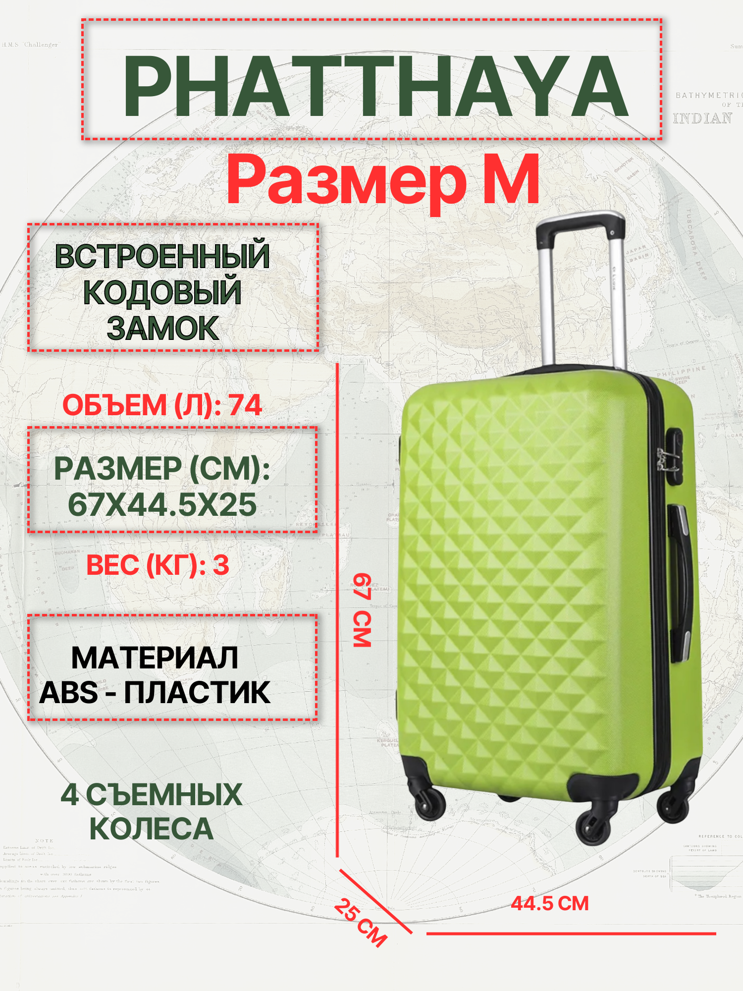 Чемодан на колесах средний М пластиковый Phatthaya дорожный, ударопрочный, съемные колеса, кодовый замок, 65см, 59л 5 072 ₽
