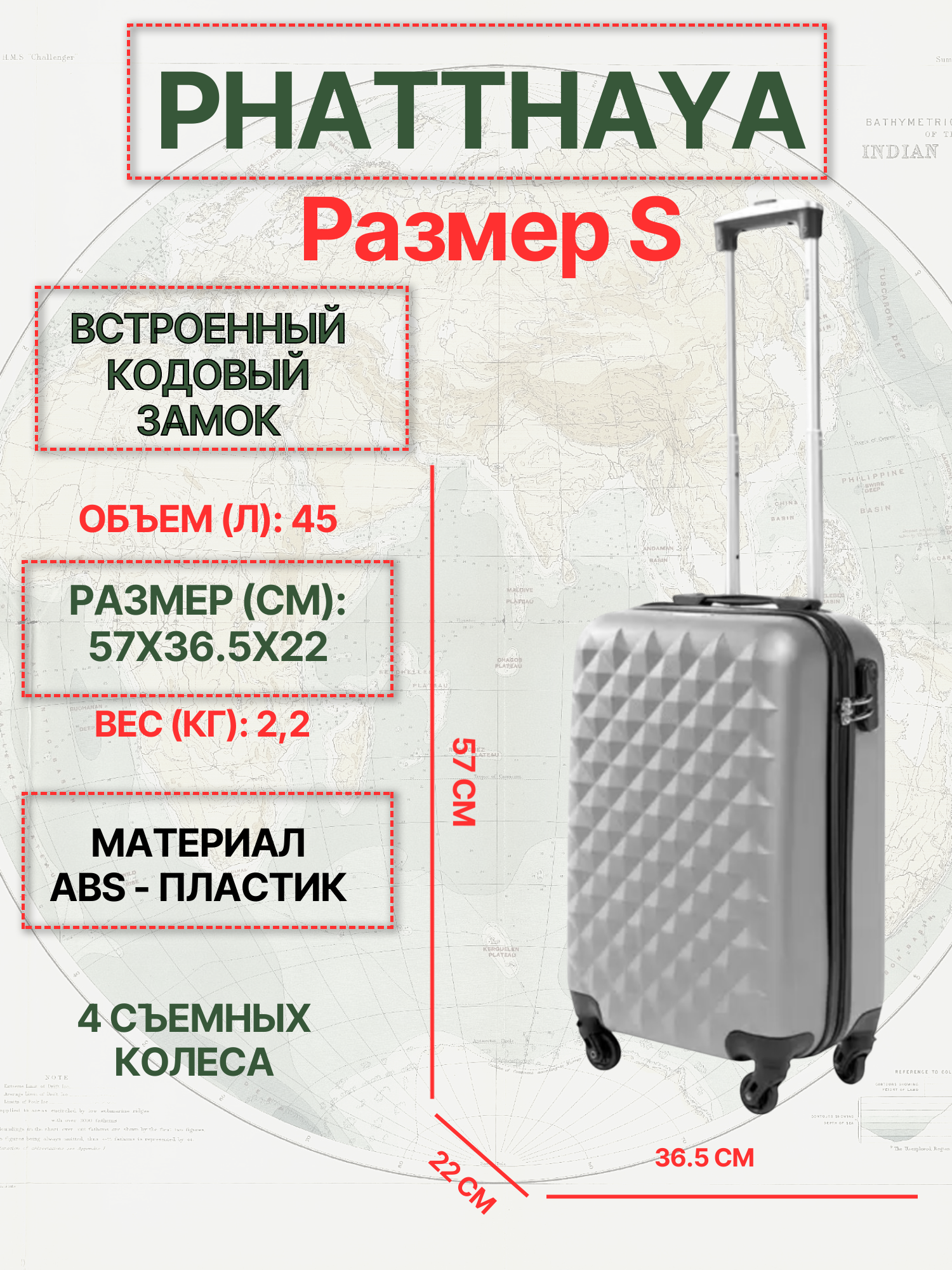 Чемодан на колесах маленький S пластиковый Phatthaya, дорожный, ударопрочный, съемные колеса, кодовый замок, ручная кладь, 56см, 33л