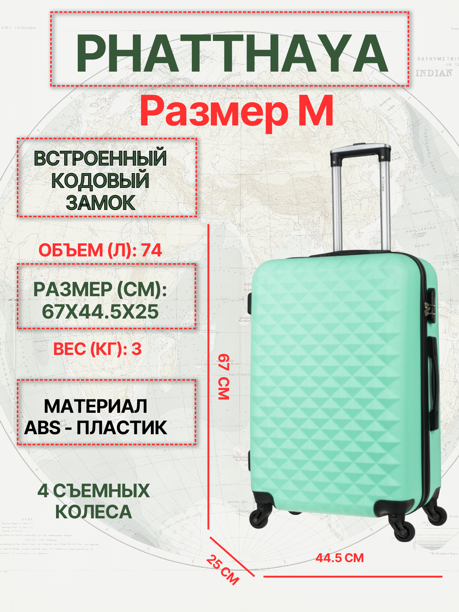 Чемодан L'case Phatthaya, 74 л, размер M, мятный информация: