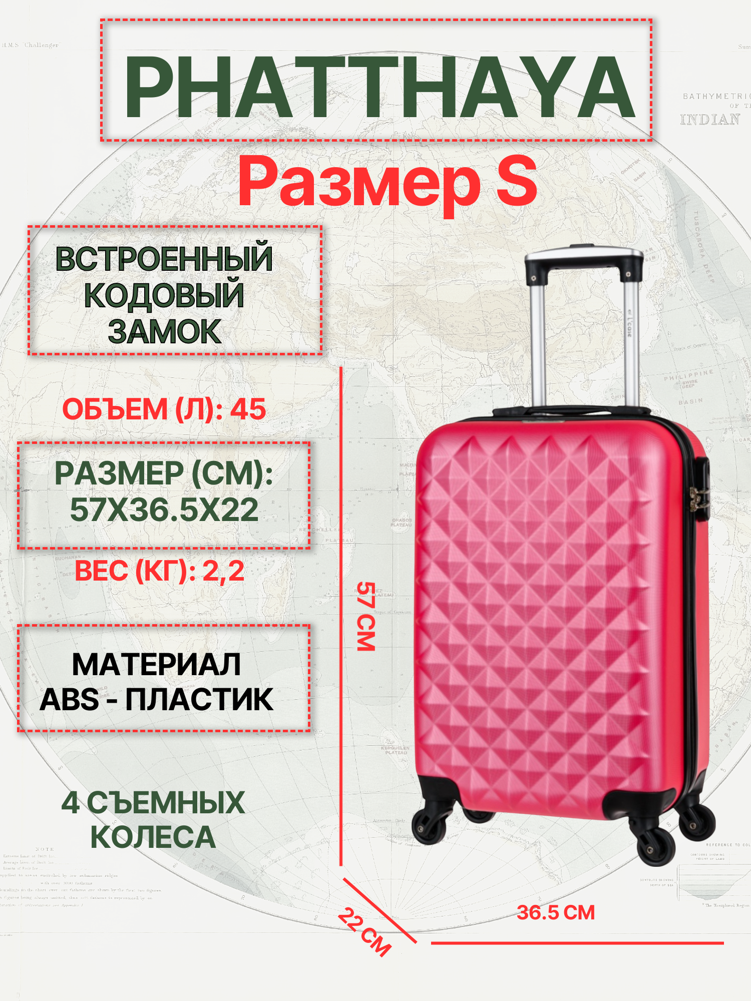 Чемодан на колесах маленький S пластиковый Phatthaya, дорожный, ударопрочный, съемные колеса, кодовый замок, ручная кладь, 56см, 33л