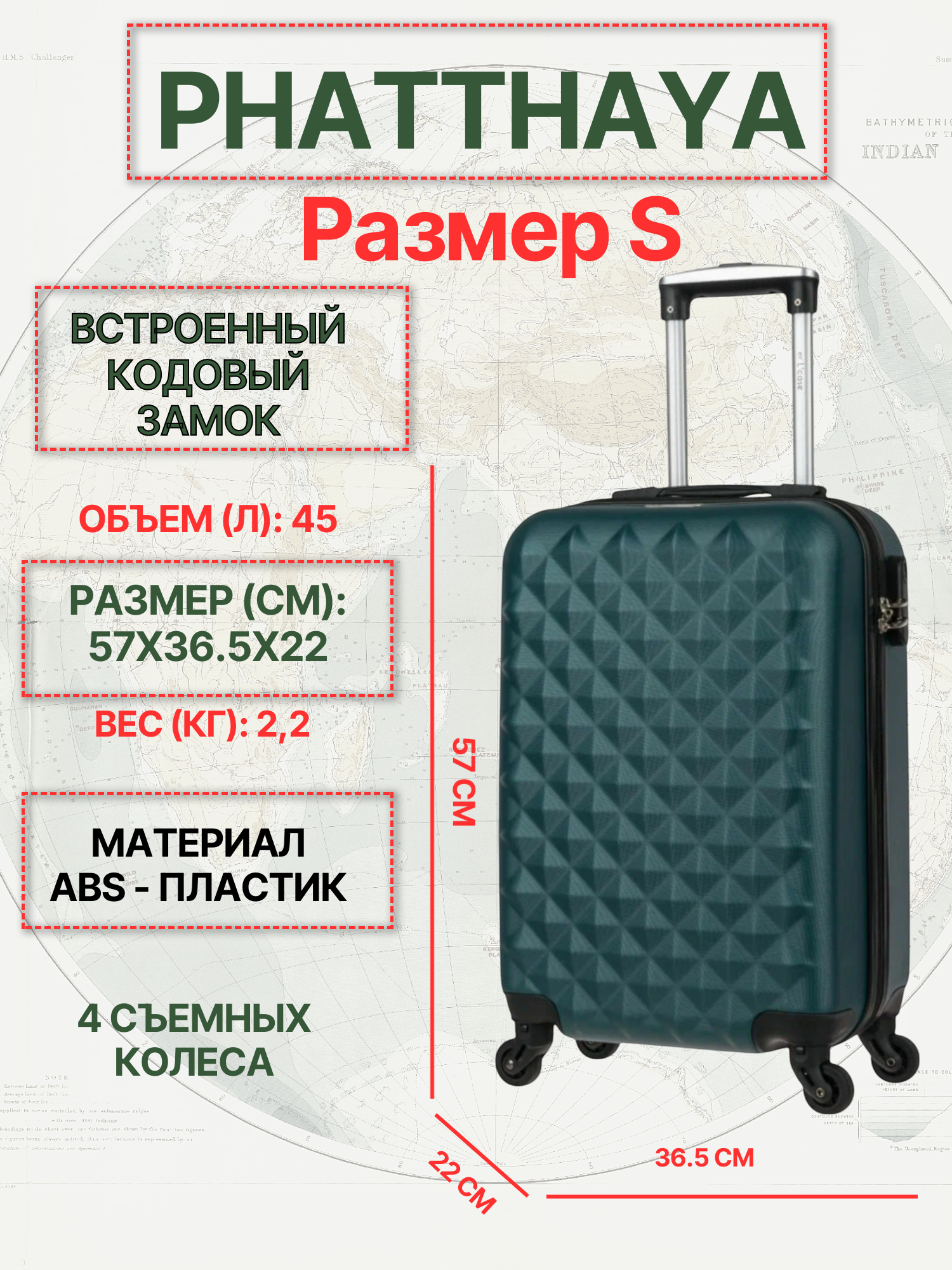 Чемодан маленький L'Case Phatthaya (S) темно-зеленый, 57х36.5х22, арт:Ch0630 4 414 ₽