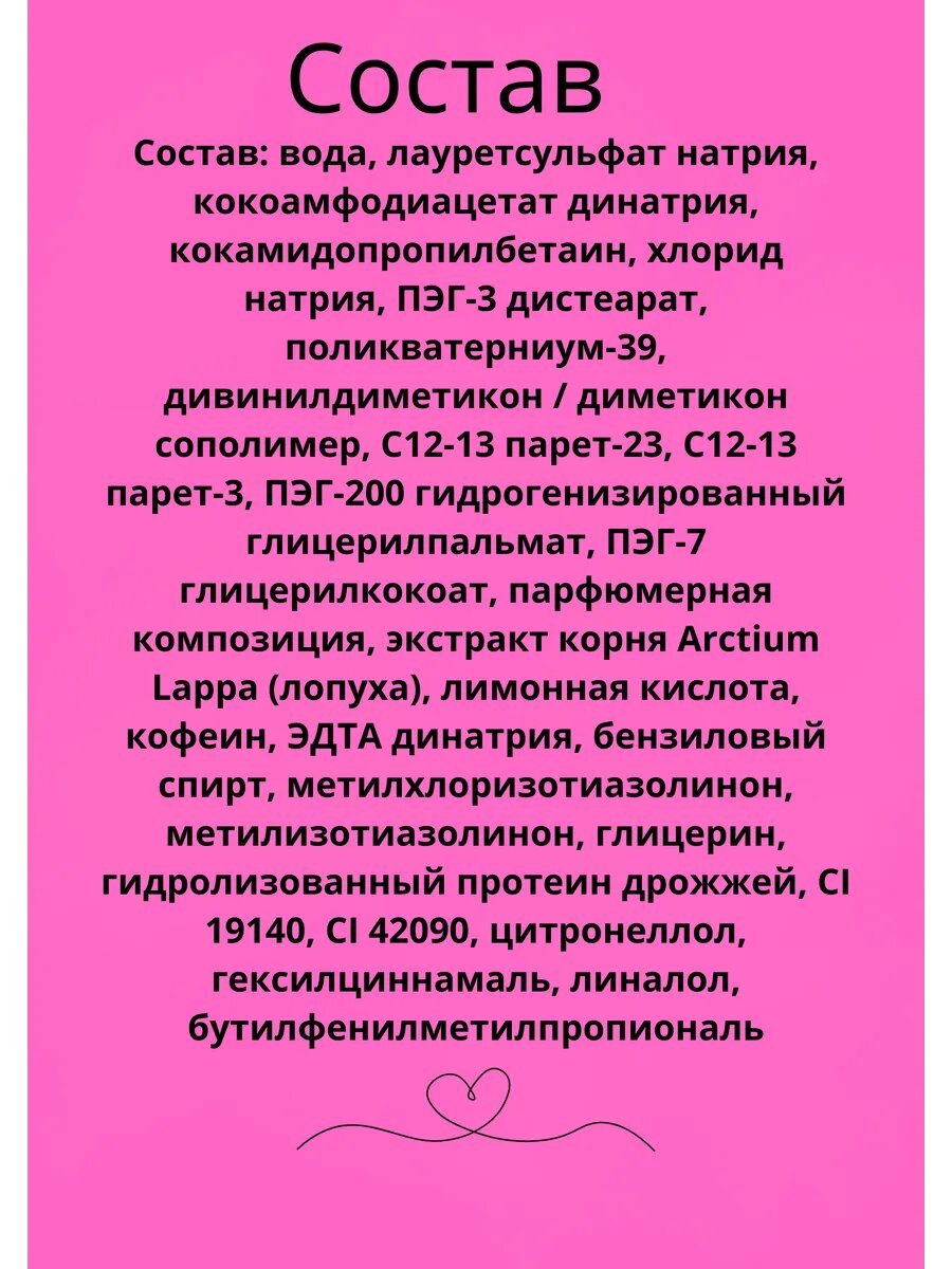 | Состав | вода, лауретсульфат натрия, кокоамфодиацетат динатрия, кокамидопропилбетаин, хлорид натрия, ПЭГ-3 дистеарат, поликватерниум-39, дивинилдиметикон / диметикон сополимер, C12-13 парет-23, C12-13 парет-3, ПЭГ-200 гидрогенизированный глицерилпальмат, ПЭГ-7 глицерилкокоат, парфюмерная композиция, экстракт корня Arctium Lappa (лопуха), лимонная кислота, кофеин, ЭДТА динатрия, бензиловый спирт, метилхлоризотиазолинон, метилизотиазолинон, глицерин, гидролизованный протеин дрожжей, CI 19140, CI 42090, цитронеллол, гексилциннамаль, линалол, бутилфенилметилпропиональ |