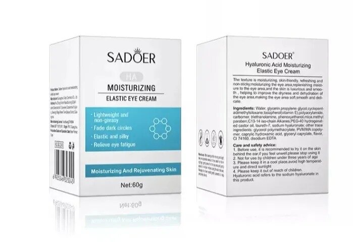| Дополнительная информация | ШИКАРНЫЙ крем для кожи вокруг глаз с гиалуроновой кислотой Sadoer HA Moisturizing Elastic Eye Cream направлен на глубокое увлажнение за счёт Концентрированной Гиалуроновой кислоты. Крем обеспечивает тройной эффект: лифтинга, увлажнения и повышения тонуса кожи. Уменьшает морщинки и мешки под глазами, устраняет темные круги. Основные действующие компоненты:Гиалуроновая кислота притягивает и удерживает влагу в клетках, благодаря чему кожа остается идеально увлажненной, гладкой и эластичной. Кроме того, гиалуроновая кислота помогает создавать защитный барьер, который препятствует окислению клеток, защищает от образования свободных радикалов и укрепляет тонкую кожу. Витамин Е обеспечивает антиоксидантный эффект, защищая клетки от свободных радикалов. Глицерин в составе косметического средства оказывает увлажняющее и смягчающее действие, устраняет микроповреждения, делает кожу гладкой и ухоженной. |